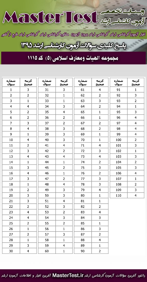 کاربران گرامی مستر تست می توانند سوالات تست آزمون کارشناسی ارشد سراسری اردیبهشت ماه ۱۳۹۵ رشته مجموعه الهیات و معارف اسلامی (۵) را از طریق لینک زیر به صورت رایگان دانلود نمایند.