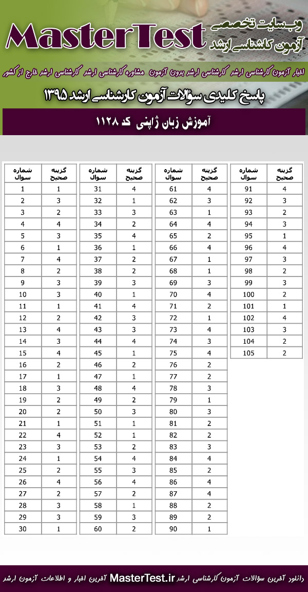 کاربران گرامی مستر تست می توانند سوالات تست آزمون کارشناسی ارشد سراسری اردیبهشت ماه ۱۳۹۵ رشته آموزش زبان ژاپنی را از طریق لینک زیر به صورت رایگان دانلود نمایند.