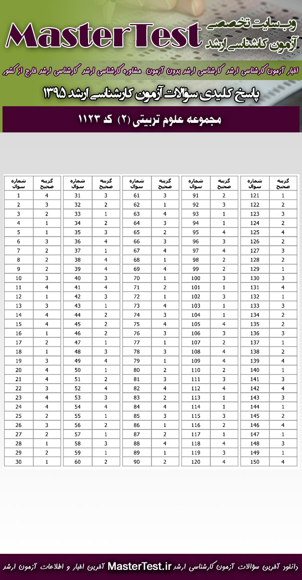 کاربران گرامی مستر تست می توانند سوالات تست آزمون کارشناسی ارشد سراسری اردیبهشت ماه ۱۳۹۵ رشته مجموعه علوم تربیتی (۲) را از طریق لینک زیر به صورت رایگان دانلود نمایند.