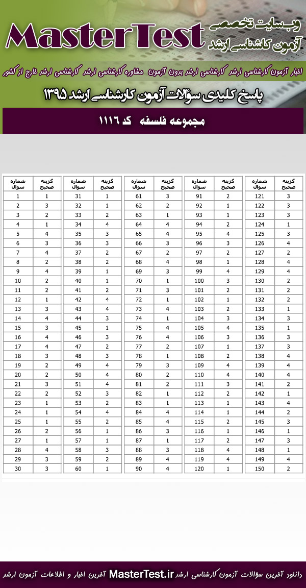 کاربران گرامی مستر تست می توانند سوالات تست آزمون کارشناسی ارشد سراسری اردیبهشت ماه ۱۳۹۵ رشته مجموعه فلسفه را از طریق لینک زیر به صورت رایگان دانلود نمایند.