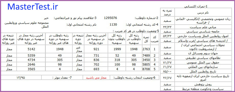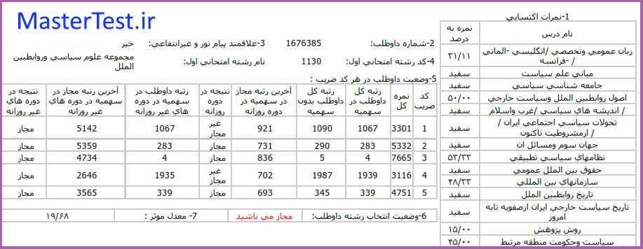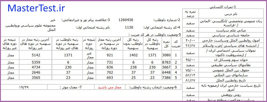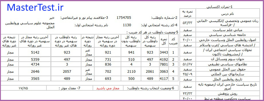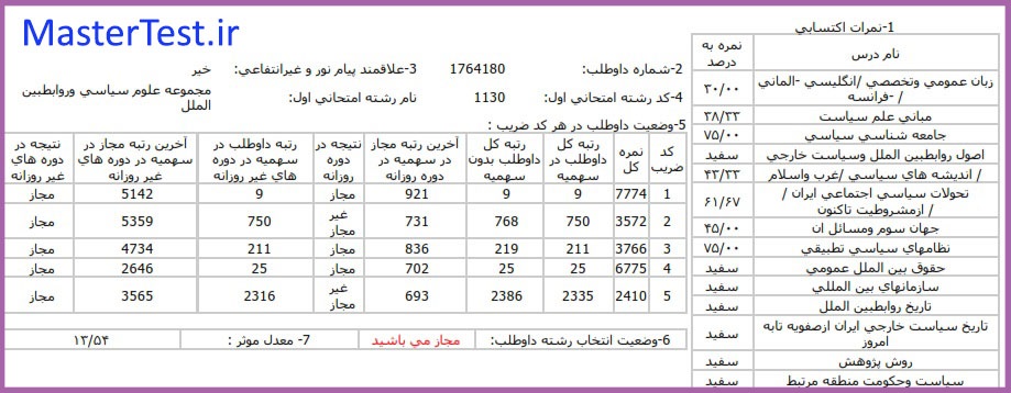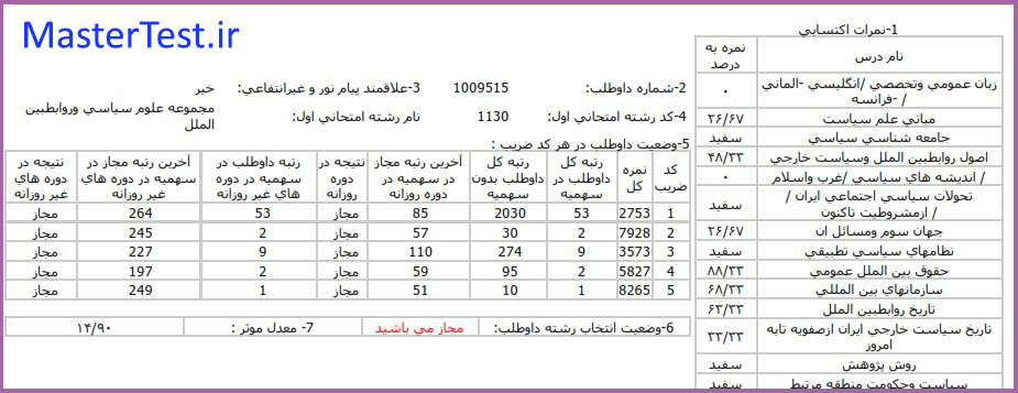 کارنامه رتبههای برتر کنکور کارشناسی ارشد رشته علوم سیاسی و روابط بینالملل کد ۱۱۳۰