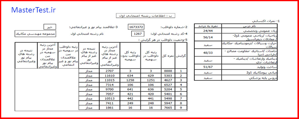 کارنامه رتبههای برتر کنکور کارشناسی ارشد رشته مهندسی مکانیک کد ۱۲۶۷