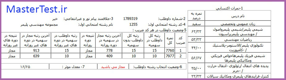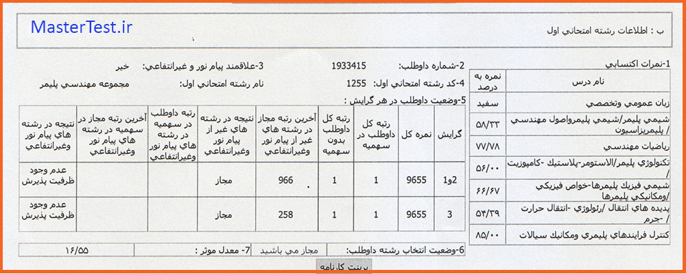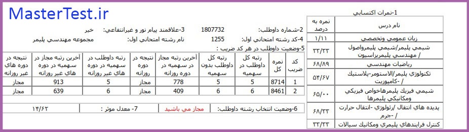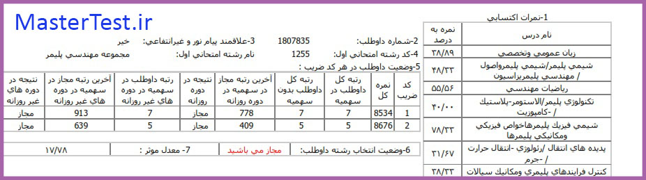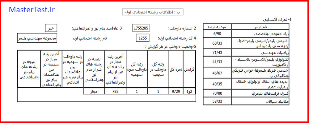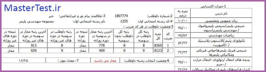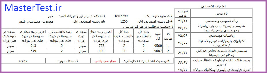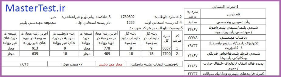 کارنامه رتبههای برتر کنکور کارشناسی ارشد رشته مهندسی پلیمر کد ۱۲۵۵