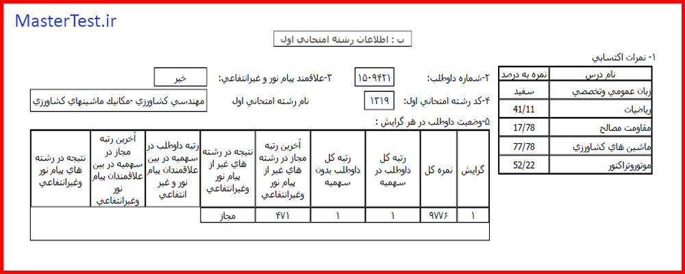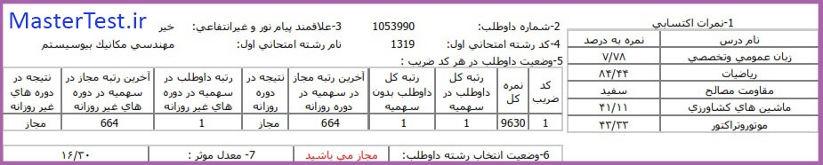 کارنامه رتبههای برتر کنکور کارشناسی ارشد رشته مهندسی مکانیک بیوسیستم کد ۱۳۱۹