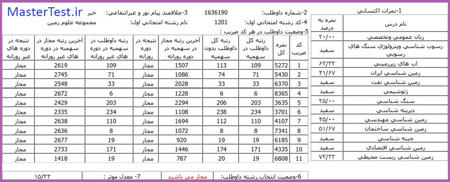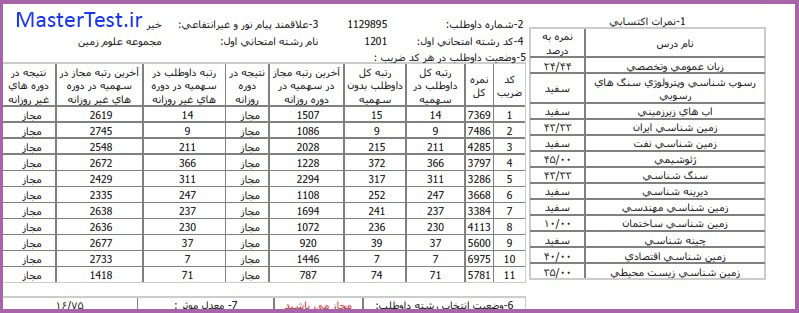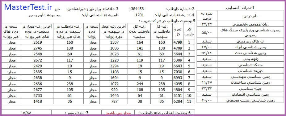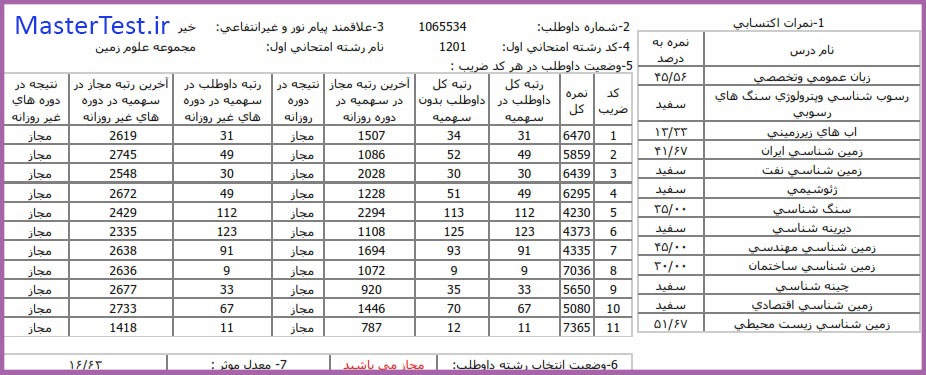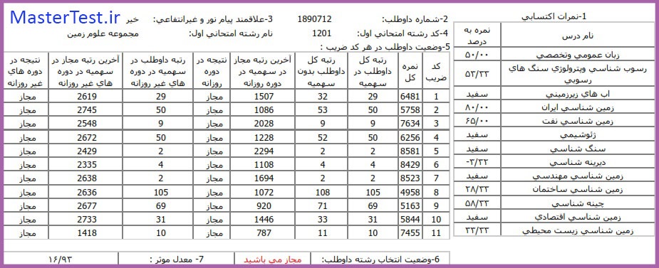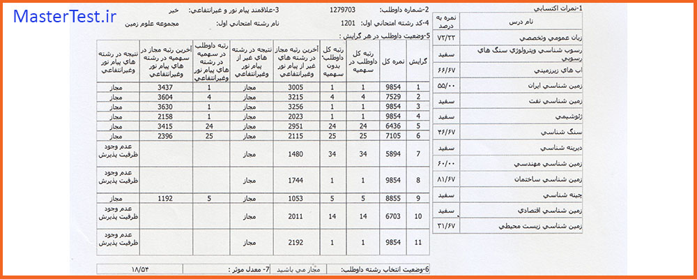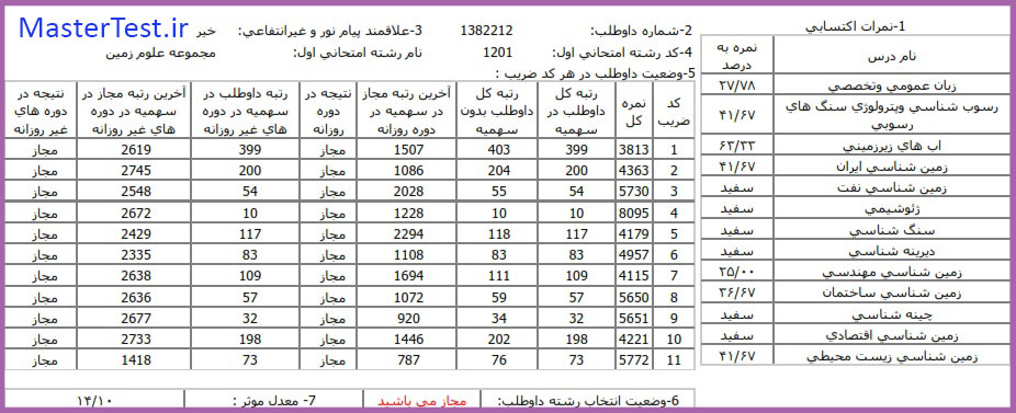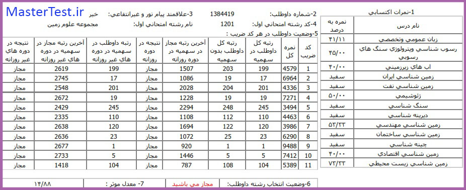 کارنامه رتبههای برتر کنکور کارشناسی ارشد رشته علوم زمین کد ۱۲۰۱