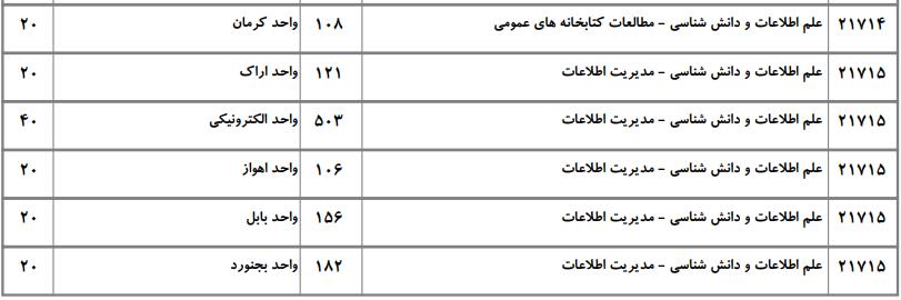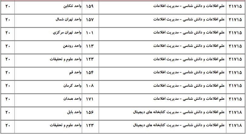 فهرست واحدهای دانشگاهی دارای پذیرش و ظرفیت کارشناسی ارشد رشته علم اطلاعات و دانش شناسی مطابق دفترچه انتخاب رشته کارشناسی ارشد دانشگاه آزاد به شرح زیر است: