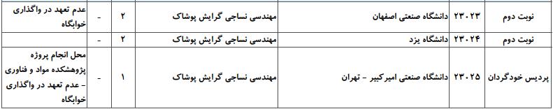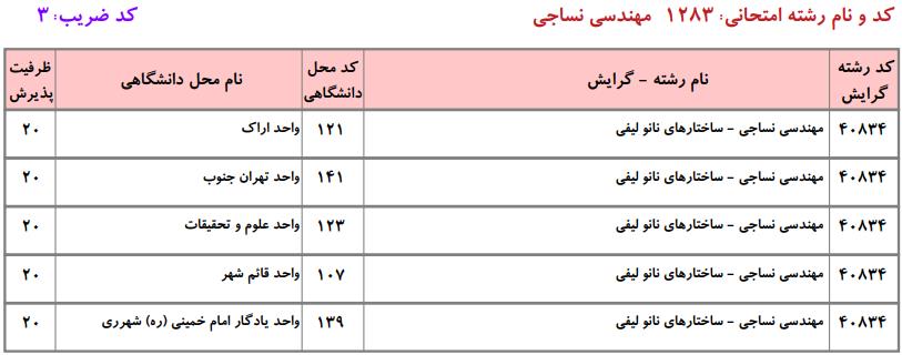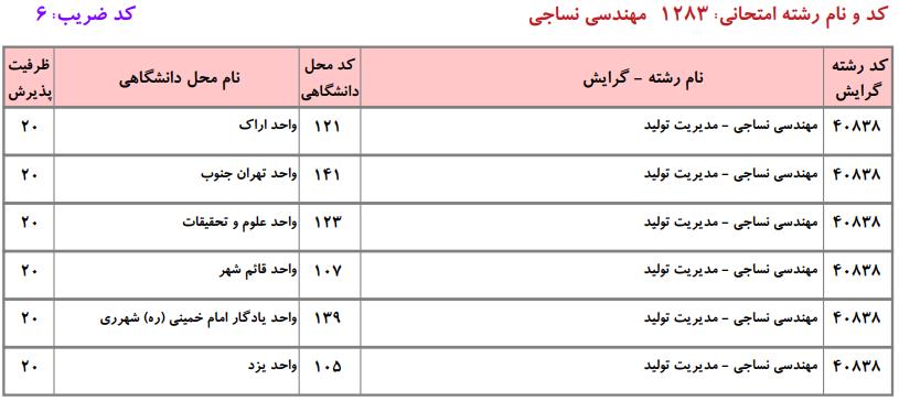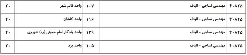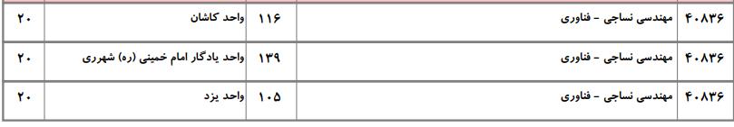 فهرست واحدهای دانشگاهی دارای پذیرش و ظرفیت کارشناسی ارشد رشته مهندسی نساجی مطابق دفترچه انتخاب رشته کارشناسی ارشد دانشگاه آزاد به شرح زیر است: