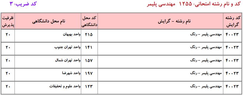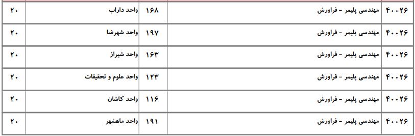 فهرست واحدهای دانشگاهی دارای پذیرش و ظرفیت کارشناسی ارشد رشته مهندسی پلیمر مطابق دفترچه انتخاب رشته کارشناسی ارشد دانشگاه آزاد به شرح زیر است: