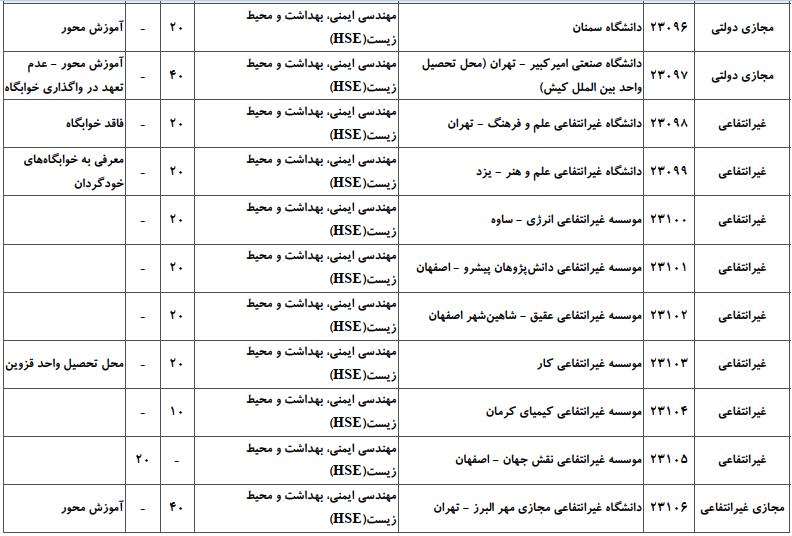جهت اطلاع داوطلبان گرامی آزمون کارشناسی ارشد، در ادامه فهرست دانشگاههای دولتی دارای پذیرش و ظرفیت پذیرش کارشناسی ارشد رشته بهداشت، ایمنی و محیط زیست (HSE) ارائه شده است: