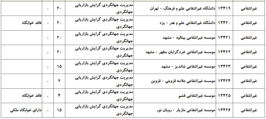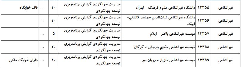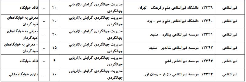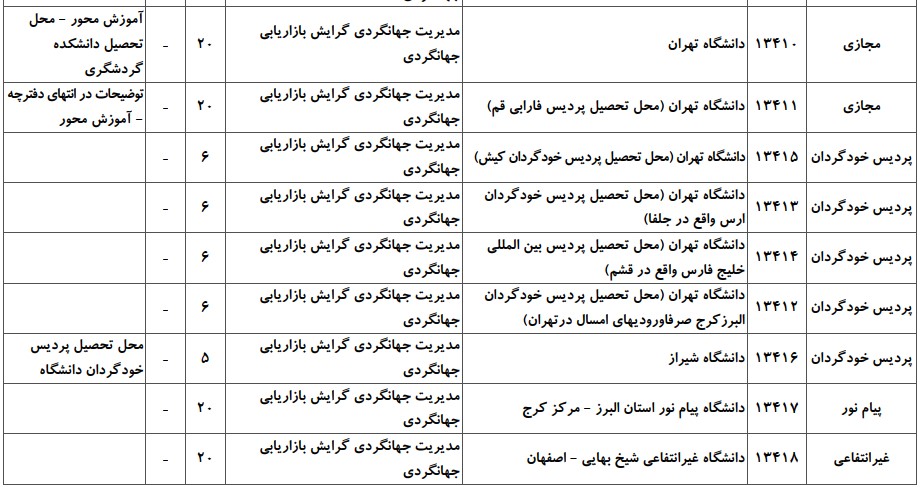فهرست واحدهای دانشگاهی دارای پذیرش و ظرفیت کارشناسی ارشد رشته مدیریت جهانگردی مطابق دفترچه انتخاب رشته کارشناسی ارشد دانشگاه آزاد به شرح زیر است: