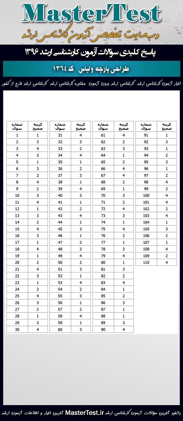 کاربران عزیز مسترتست میتوانند دفترچه سؤالات آزمون کارشناسی ارشد دانشگاههای سراسری و آزاد اردیبهشت ماه ۱۳۹۶ رشته طراحی پارچه و لباس را از طریق لینک زیر به صورت رایگان دانلود نمایند.