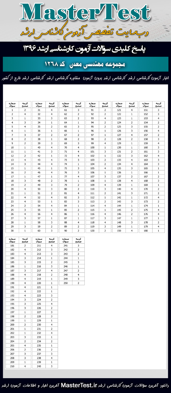 کاربران عزیز مسترتست میتوانند دفترچه سؤالات آزمون کارشناسی ارشد دانشگاههای سراسری و آزاد اردیبهشت ماه ۱۳۹۶ مجموعه مهندسی معدن شامل گرایشهایِ