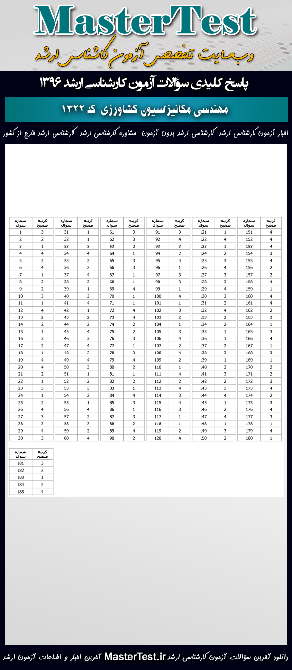 کاربران عزیز مسترتست میتوانند دفترچه سؤالات آزمون کارشناسی ارشد دانشگاههای سراسری و آزاد اردیبهشت ماه ۱۳۹۶ رشته مهندسی مکانیزاسیون کشاورزی شامل گرایشهایِ