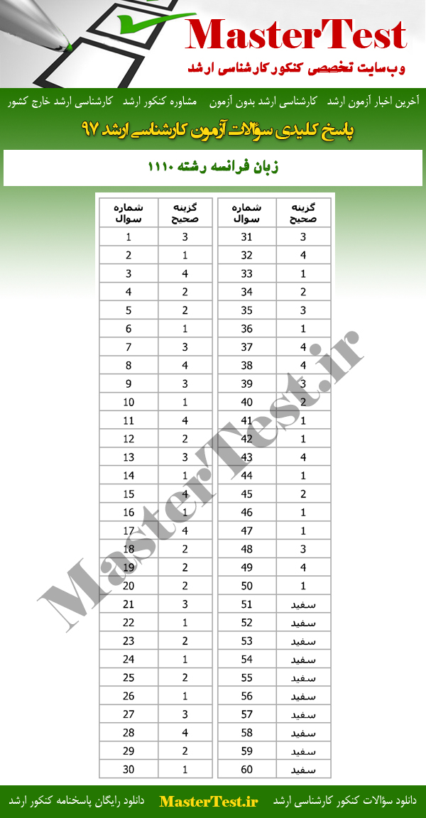 پاسخنامه کلیدی سؤالات کارشناسی ارشد ۹۷ زبان فرانسه برای کد رشته ۱۱۱۰