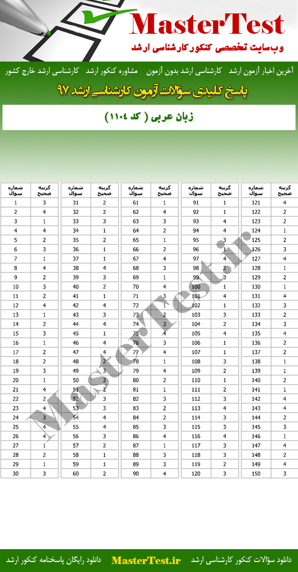 کاربران گرامی سایت کارشناسی ارشد مسترتست میتوانند دفترچه سؤالات کنکور کارشناسی ارشد سال ۹۷ دانشگاههای سراسری و آزاد اسلامی مجموعه زبان عربی شامل گرایشهای: