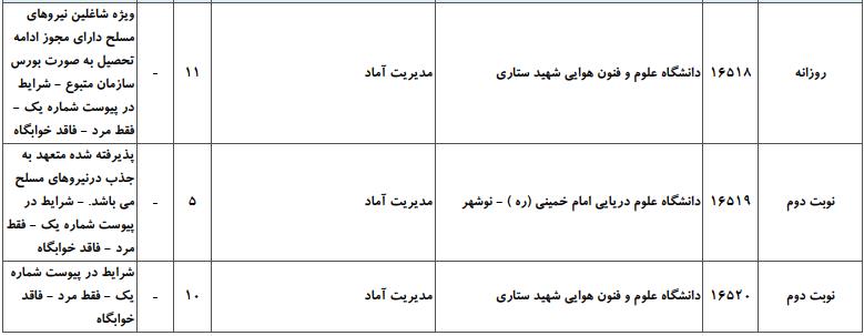 (پذیرش دانشجو در این رشته فقط توسط دانشگاه های «علوم و فنون هوایی شهید ستاری»، «علوم دریایی امام خمینی (ره) » و «علوم انتظامی امین» و فقط از میان برادران انجام خواهد شد.)