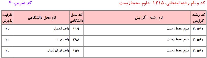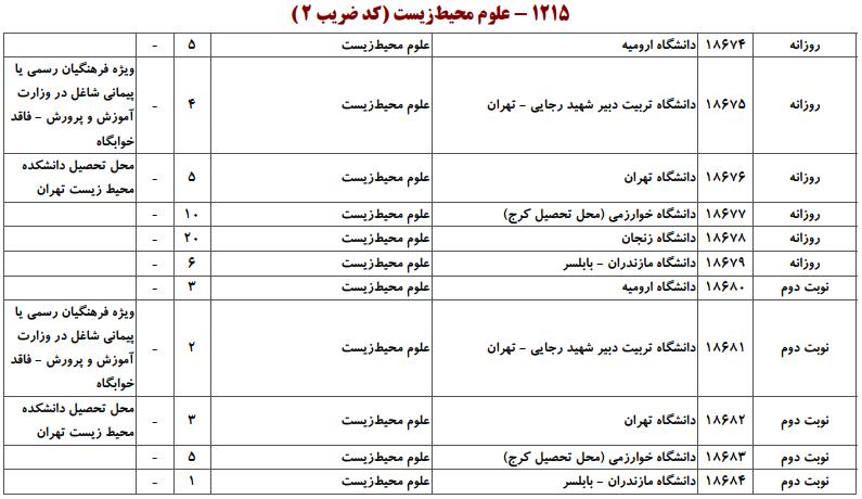 با توجه به این که تغییرات دانشگاههای پذیرنده یک رشته در مقطع کارشناسی ارشد در سالهای مختلف تغییرات زیادی ندارد، دانشگاههای جداول زیر که مربوط به آزمون کارشناسی ارشد سال گذشته است، میتواند به داوطلبان عزیز جهت اطلاع از گرایشهای کارشناسی ارشد علوم محیط زیست و نیز دانشگاههایی که در دورههای مختلف روزانه، شبانه، پردیس، غیرانتفاعی، پیام نور و دانشگاه آزاد اﺳﻼمی در رشته علوم محیط زیست پذیرش دارند، کمک کند.