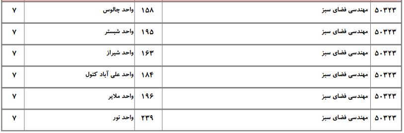 با توجه به این که تغییرات دانشگاههای پذیرنده یک رشته در مقطع کارشناسی ارشد در سالهای مختلف تغییرات زیادی ندارد، دانشگاههای جداول زیر که مربوط به آزمون کارشناسی ارشد سال گذشته است، میتواند به داوطلبان عزیز جهت اطلاع از گرایشهای کارشناسی ارشد مهندسی فضای سبز و نیز دانشگاههایی که در دورههای مختلف روزانه، شبانه، پردیس، غیرانتفاعی، پیام نور و دانشگاه آزاد اﺳﻼمی در رشته مهندسی فضای سبز پذیرش دارند، کمک کند.