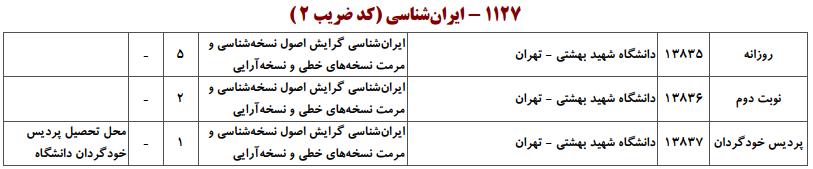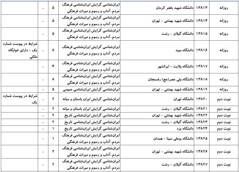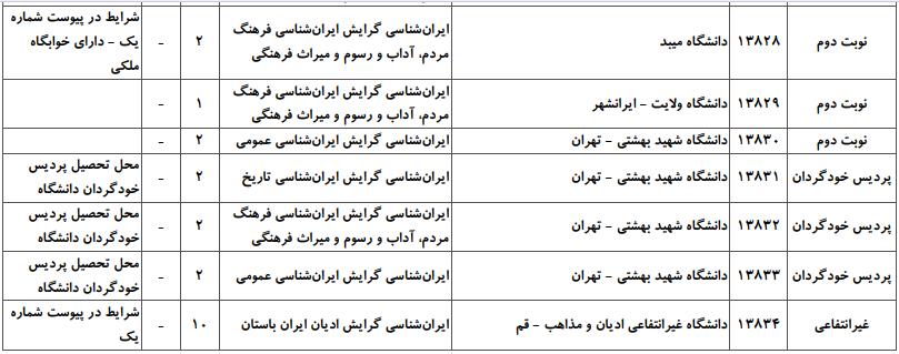 با توجه به این که تغییرات دانشگاههای پذیرنده یک رشته در مقطع کارشناسی ارشد در سالهای مختلف تغییرات زیادی ندارد، دانشگاههای جداول زیر که مربوط به آزمون کارشناسی ارشد سال گذشته است، میتواند به داوطلبان عزیز جهت اطلاع از گرایشهای کارشناسی ارشد ایران شناسی و نیز دانشگاههایی که در دورههای مختلف روزانه، شبانه، پردیس، غیرانتفاعی، پیام نور و دانشگاه آزاد اﺳﻼمی در رشته ایران شناسی پذیرش دارند، کمک کند.