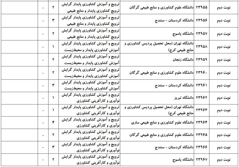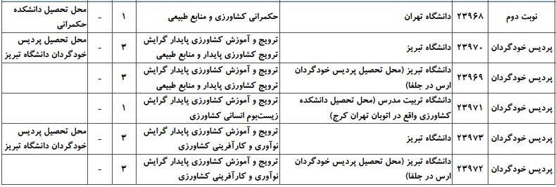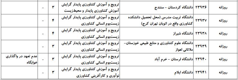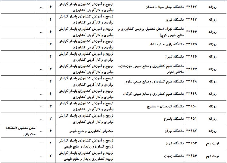 با توجه به این که تغییرات دانشگاههای پذیرنده یک رشته در مقطع کارشناسی ارشد در سالهای مختلف تغییرات زیادی ندارد، دانشگاههای جداول زیر که مربوط به آزمون کارشناسی ارشد سال گذشته است، میتواند به داوطلبان عزیز جهت اطلاع از گرایشهای کارشناسی ارشد ترویج و آموزش کشاورزی و نیز دانشگاههایی که در دورههای مختلف روزانه، شبانه، پردیس، غیرانتفاعی، پیام نور و دانشگاه آزاد اﺳﻼمی در رشته ترویج و آموزش کشاورزی پذیرش دارند، کمک کند.