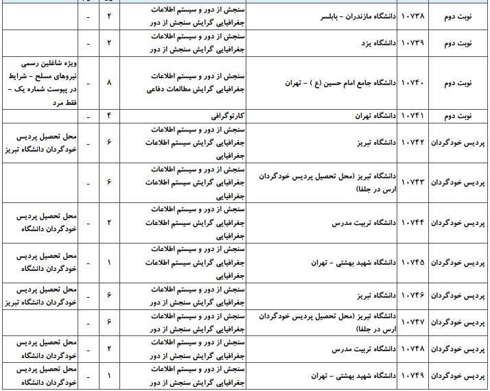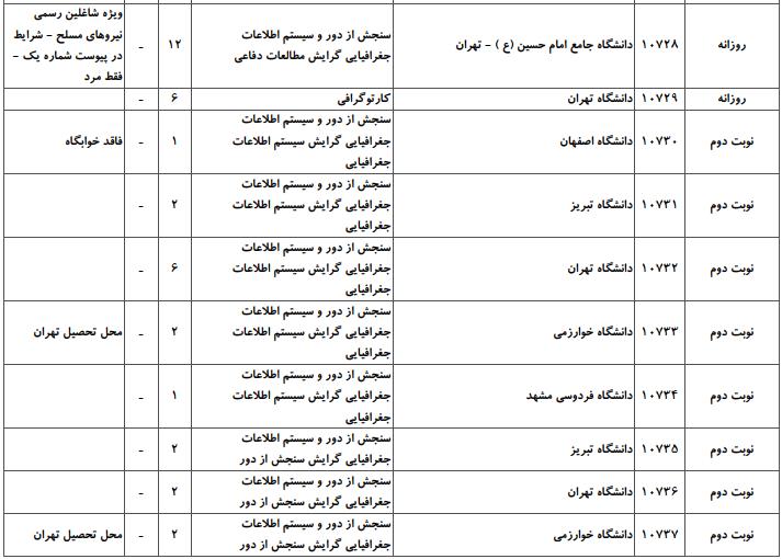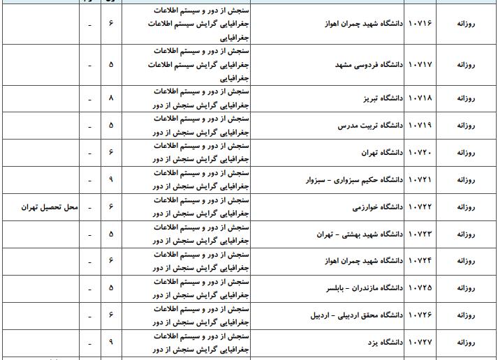 با توجه به این که تغییرات دانشگاههای پذیرنده یک رشته در مقطع کارشناسی ارشد در سالهای مختلف تغییرات زیادی ندارد، دانشگاههای جداول زیر که مربوط به آزمون کارشناسی ارشد سال گذشته است، میتواند به داوطلبان عزیز جهت اطلاع از گرایشهای کارشناسی ارشد سنجش از دور و سیستم اطلاعات جغرافیایی و نیز دانشگاههایی که در دورههای مختلف روزانه، شبانه، پردیس، غیرانتفاعی، پیام نور و دانشگاه آزاد اﺳﻼمی در رشته سنجش از دور و سیستم اطلاعات جغرافیایی پذیرش دارند، کمک کند.