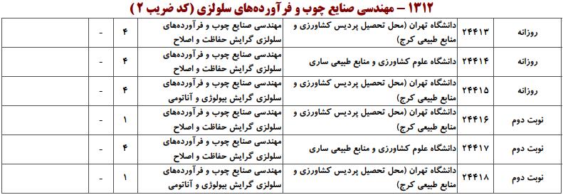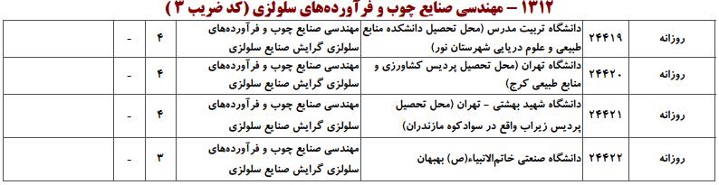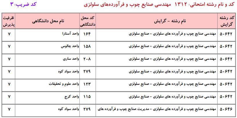 با توجه به این که تغییرات دانشگاههای پذیرنده یک رشته در مقطع کارشناسی ارشد در سالهای مختلف تغییرات زیادی ندارد، دانشگاههای جداول زیر که مربوط به آزمون کارشناسی ارشد سال گذشته است، میتواند به داوطلبان عزیز جهت اطلاع از گرایشهای کارشناسی ارشد مهندسی صنایع چوب و فرآوردههای سلولزی و نیز دانشگاههایی که در دورههای مختلف روزانه، شبانه، پردیس، غیرانتفاعی، پیام نور و دانشگاه آزاد اﺳﻼمی در رشته مهندسی صنایع چوب و فرآوردههای سلولزی پذیرش دارند، کمک کند.