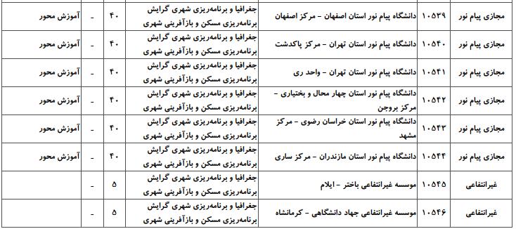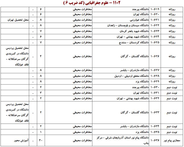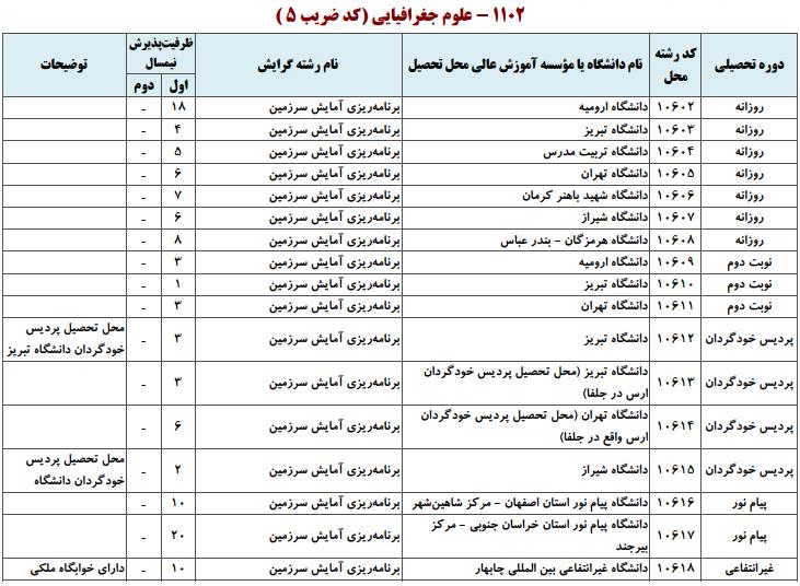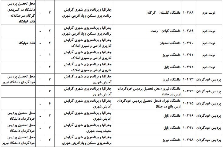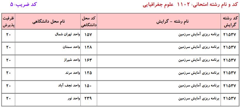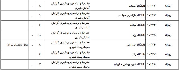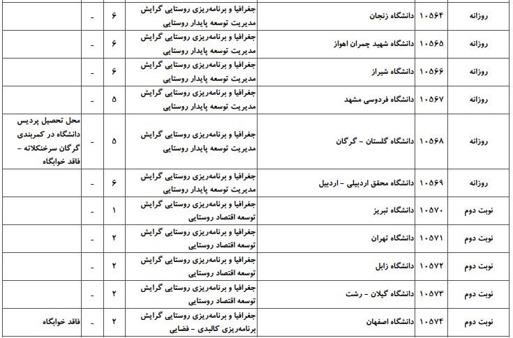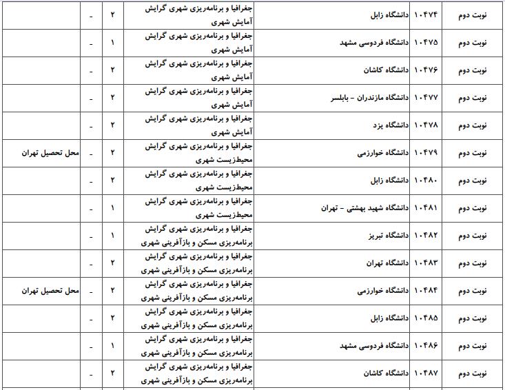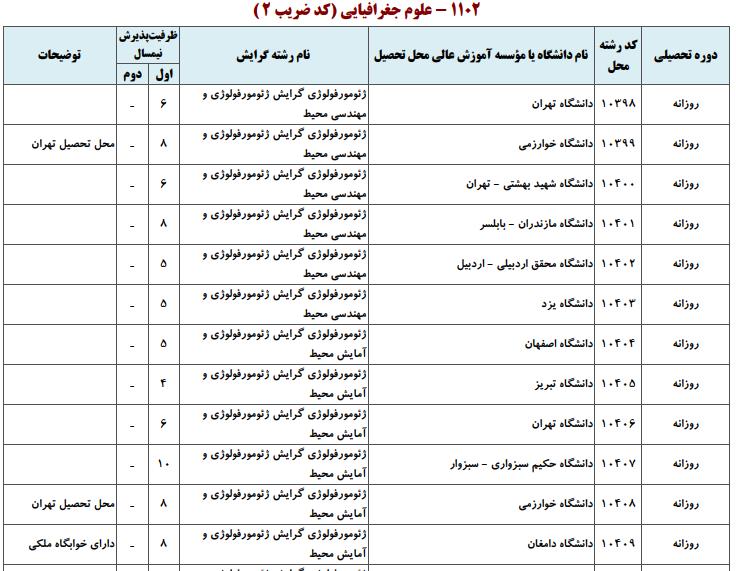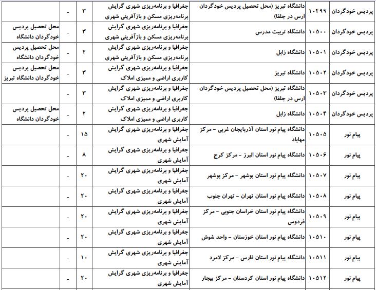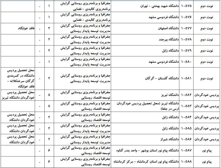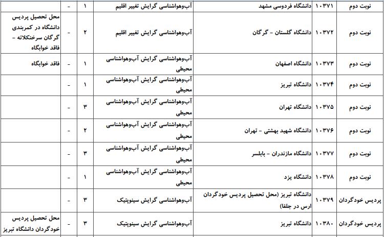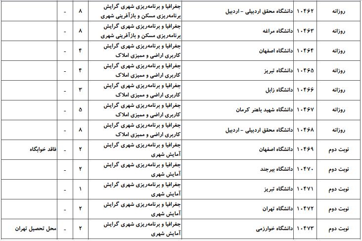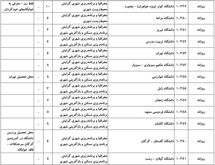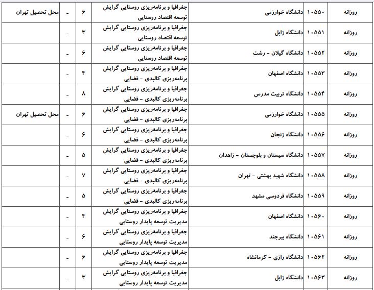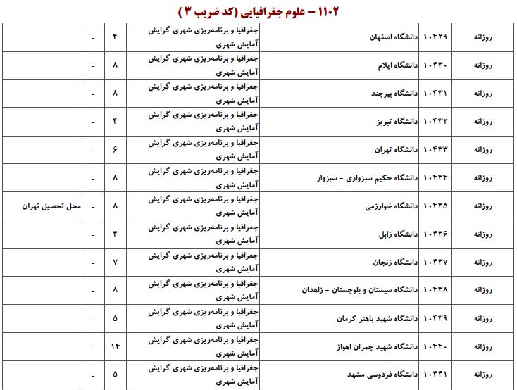 با توجه به این که تغییرات دانشگاههای پذیرنده یک رشته در مقطع کارشناسی ارشد در سالهای مختلف تغییرات زیادی ندارد، دانشگاههای جداول زیر که مربوط به آزمون کارشناسی ارشد سال گذشته است، میتواند به داوطلبان عزیز جهت اطلاع از گرایشهای کارشناسی ارشد علوم جغرافیایی و نیز دانشگاههایی که در دورههای مختلف روزانه، شبانه، پردیس، غیرانتفاعی، پیام نور و دانشگاه آزاد اﺳﻼمی در رشته علوم جغرافیایی پذیرش دارند، کمک کند.