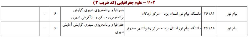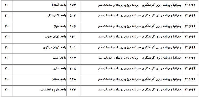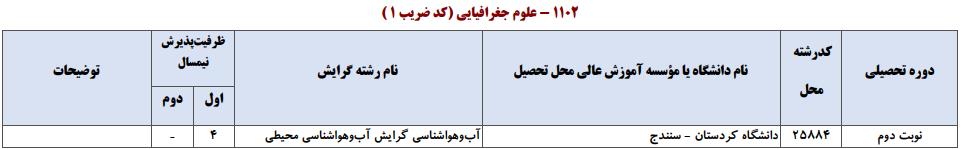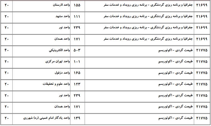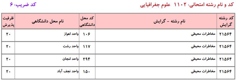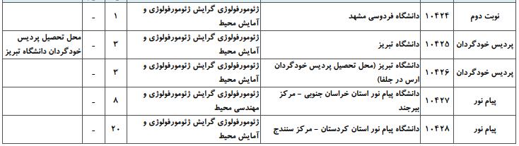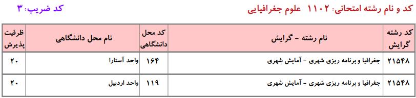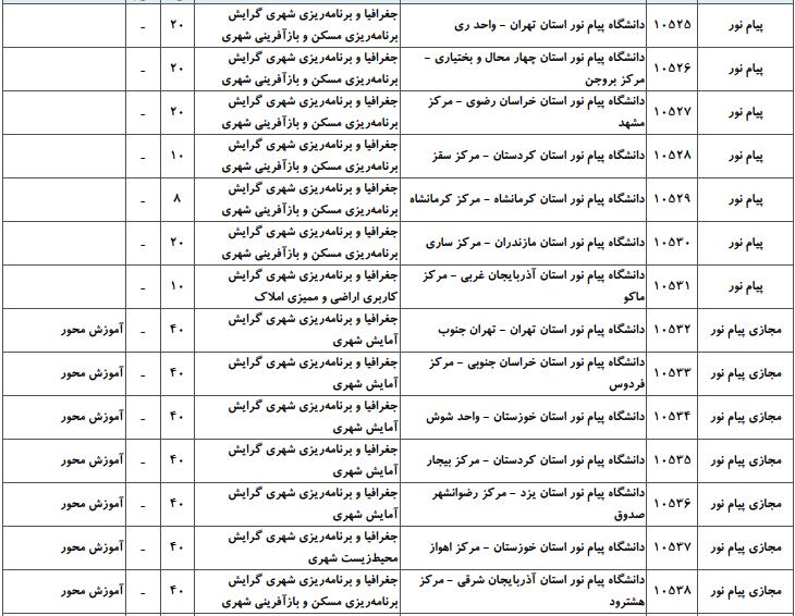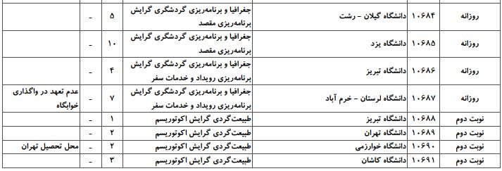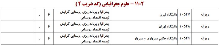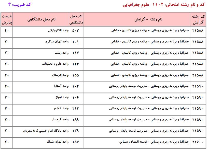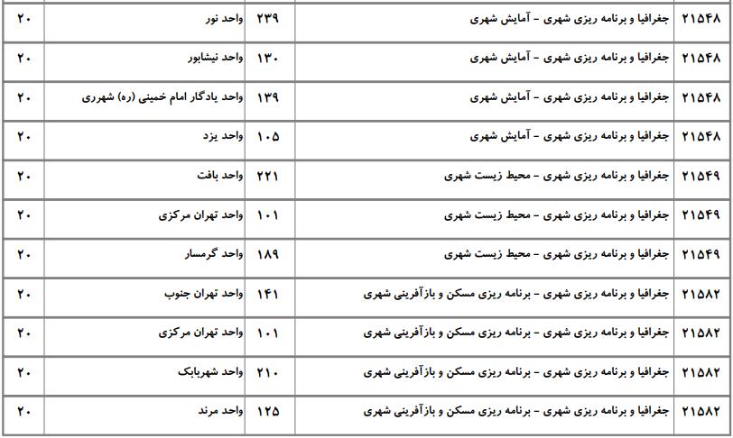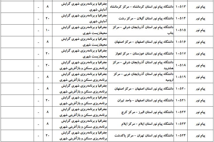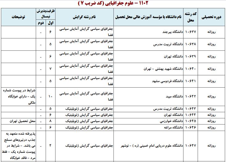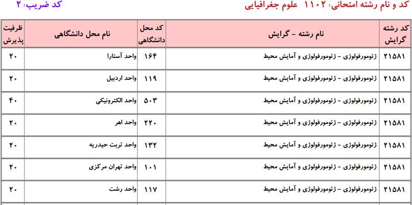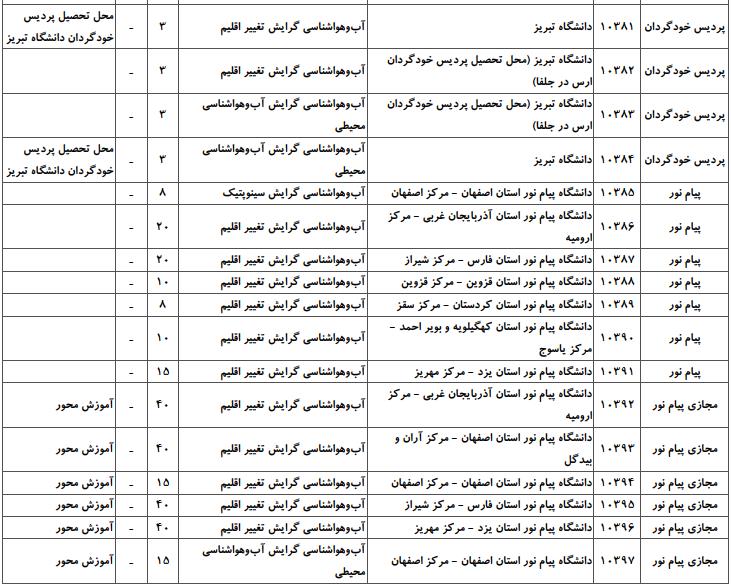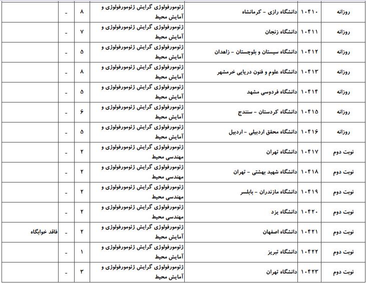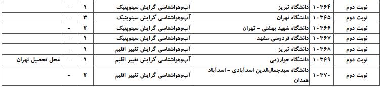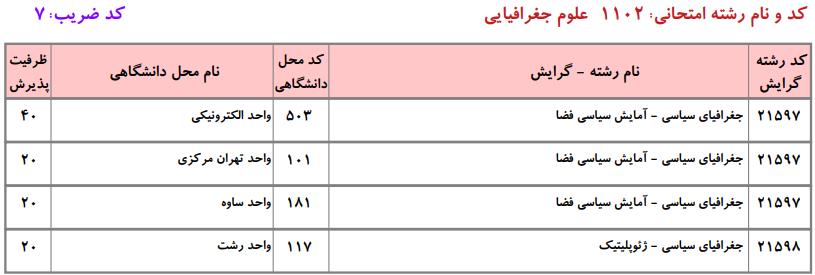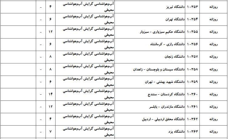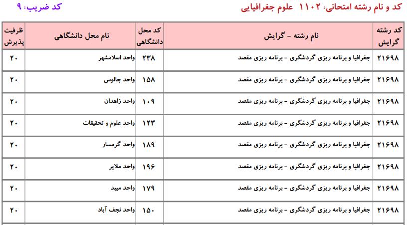 با توجه به این که تغییرات دانشگاههای پذیرنده یک رشته در مقطع کارشناسی ارشد در سالهای مختلف تغییرات زیادی ندارد، دانشگاههای جداول زیر که مربوط به آزمون کارشناسی ارشد سال گذشته است، میتواند به داوطلبان عزیز جهت اطلاع از گرایشهای کارشناسی ارشد علوم جغرافیایی و نیز دانشگاههایی که در دورههای مختلف روزانه، شبانه، پردیس، غیرانتفاعی، پیام نور و دانشگاه آزاد اﺳﻼمی در رشته علوم جغرافیایی پذیرش دارند، کمک کند.