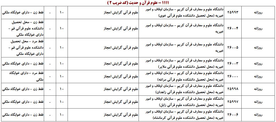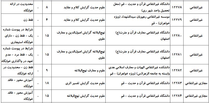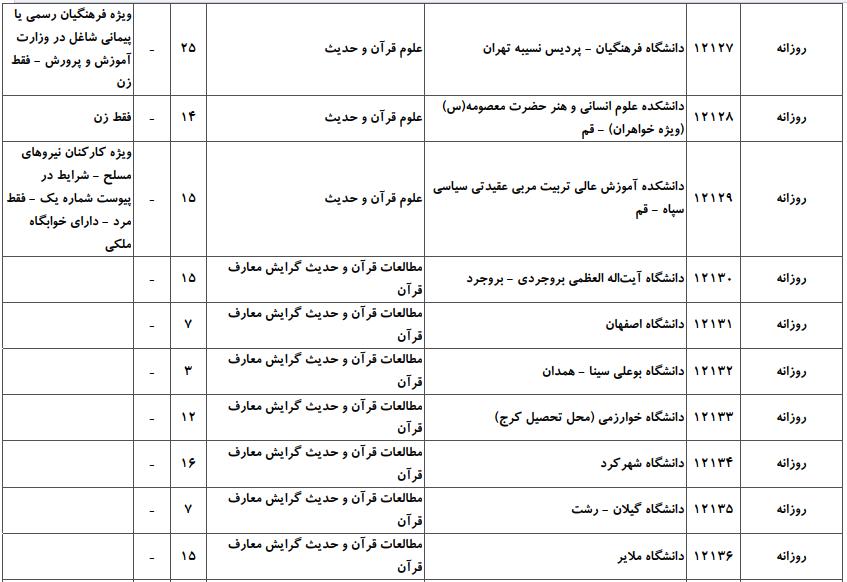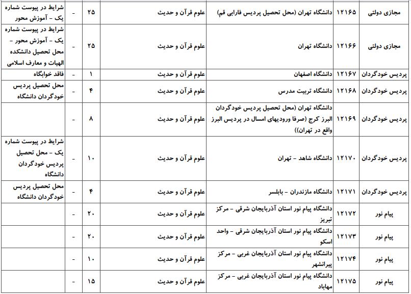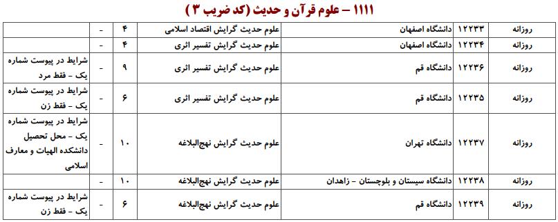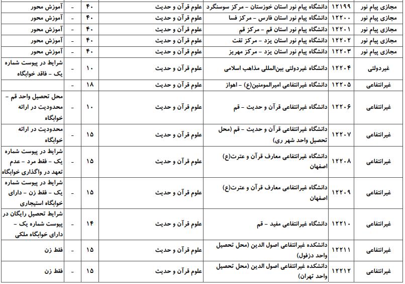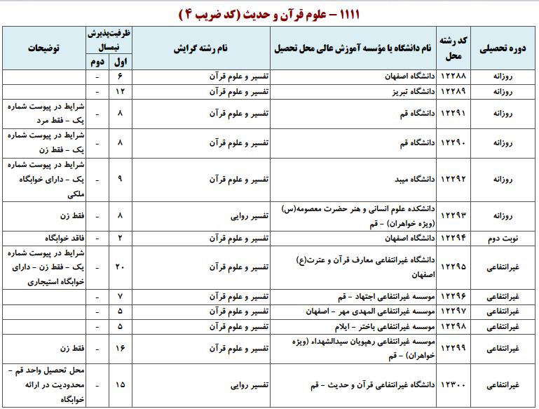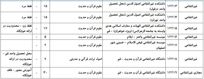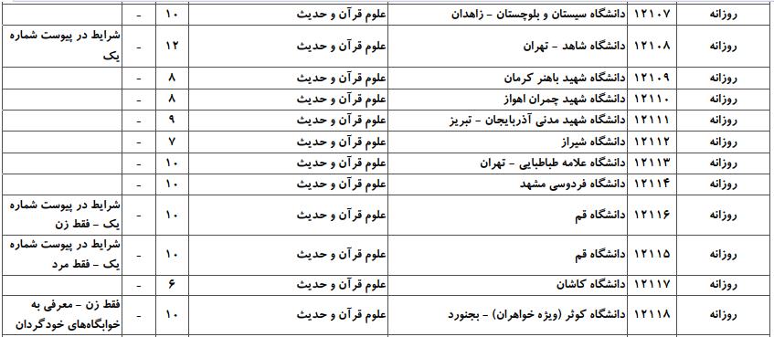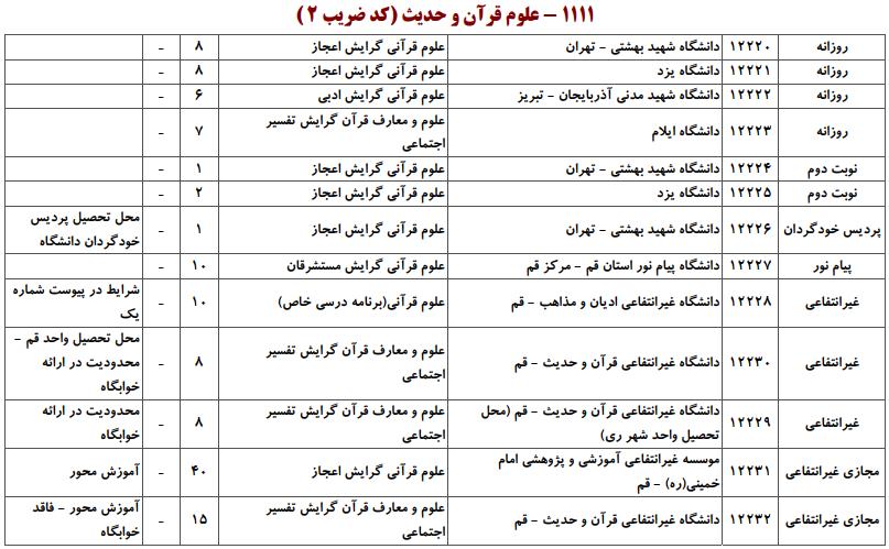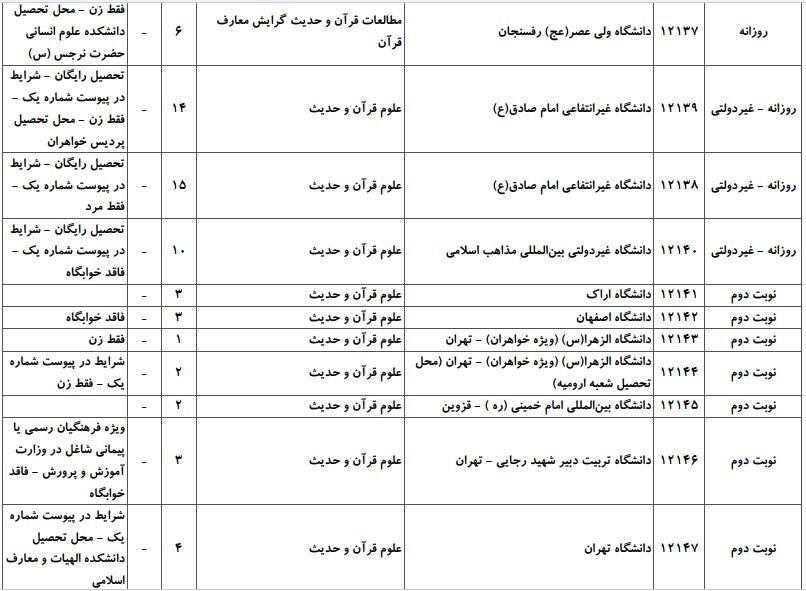 با توجه به این که تغییرات دانشگاههای پذیرنده یک رشته در مقطع کارشناسی ارشد در سالهای مختلف تغییرات زیادی ندارد، دانشگاههای جداول زیر که مربوط به آزمون کارشناسی ارشد سال گذشته است، میتواند به داوطلبان عزیز جهت اطلاع از گرایشهای کارشناسی ارشد علوم قرآن و حدیث و نیز دانشگاههایی که در دورههای مختلف روزانه، شبانه، پردیس، غیرانتفاعی، پیام نور و دانشگاه آزاد اﺳﻼمی در رشته علوم قرآن و حدیث پذیرش دارند، کمک کند.