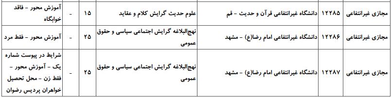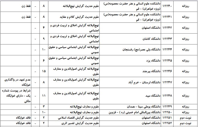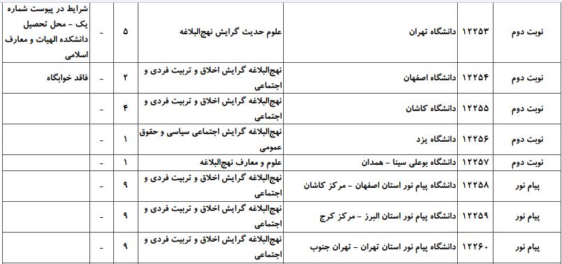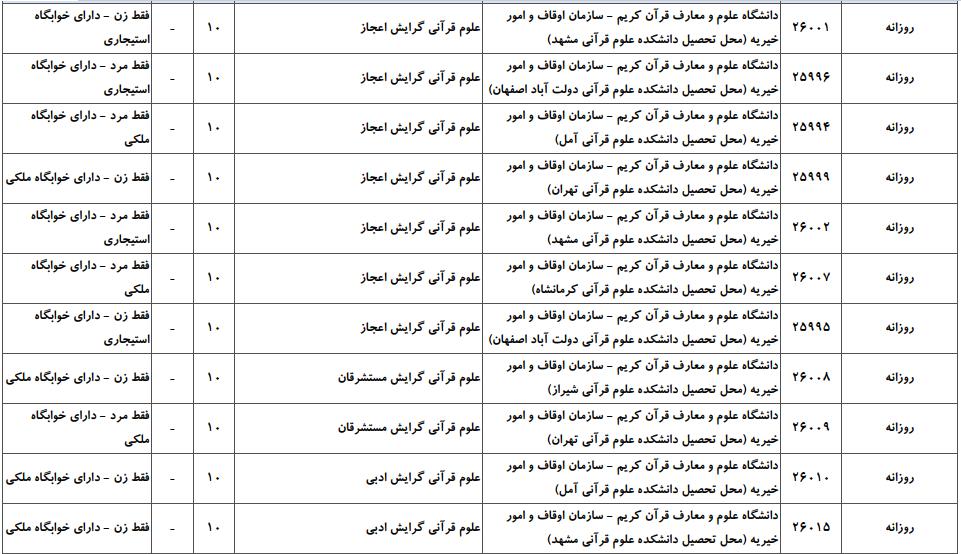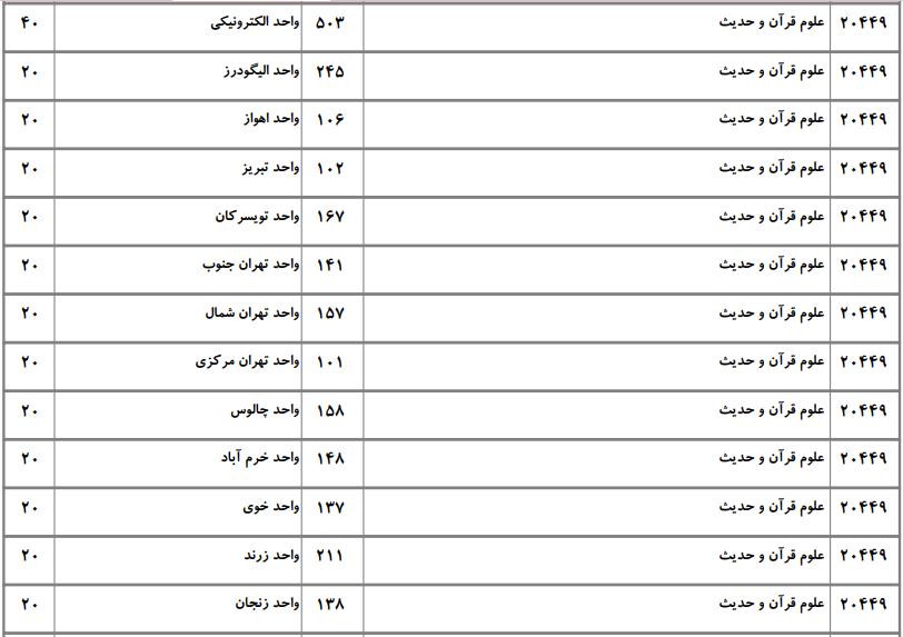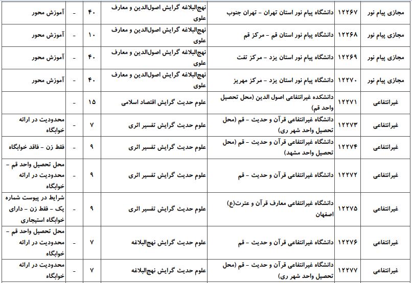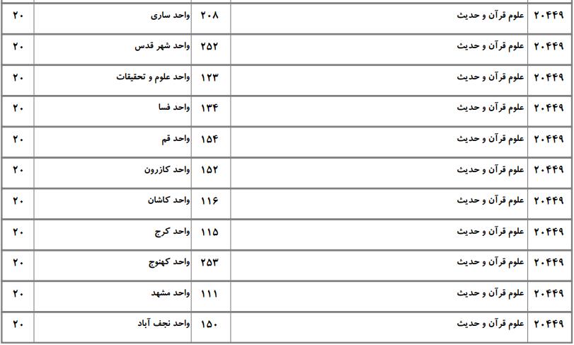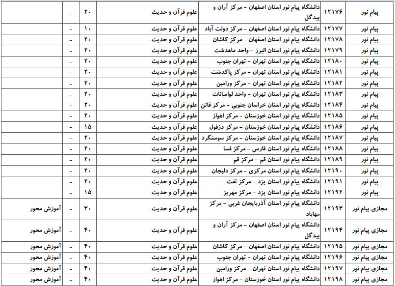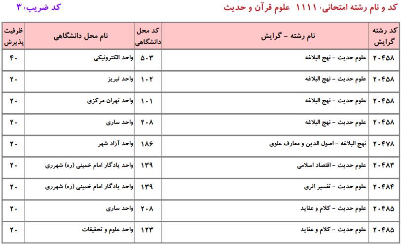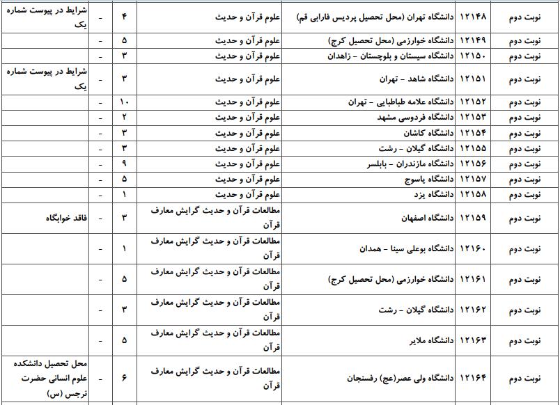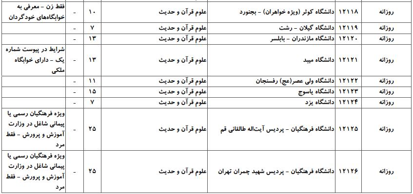 با توجه به این که تغییرات دانشگاههای پذیرنده یک رشته در مقطع کارشناسی ارشد در سالهای مختلف تغییرات زیادی ندارد، دانشگاههای جداول زیر که مربوط به آزمون کارشناسی ارشد سال گذشته است، میتواند به داوطلبان عزیز جهت اطلاع از گرایشهای کارشناسی ارشد علوم قرآن و حدیث و نیز دانشگاههایی که در دورههای مختلف روزانه، شبانه، پردیس، غیرانتفاعی، پیام نور و دانشگاه آزاد اﺳﻼمی در رشته علوم قرآن و حدیث پذیرش دارند، کمک کند.