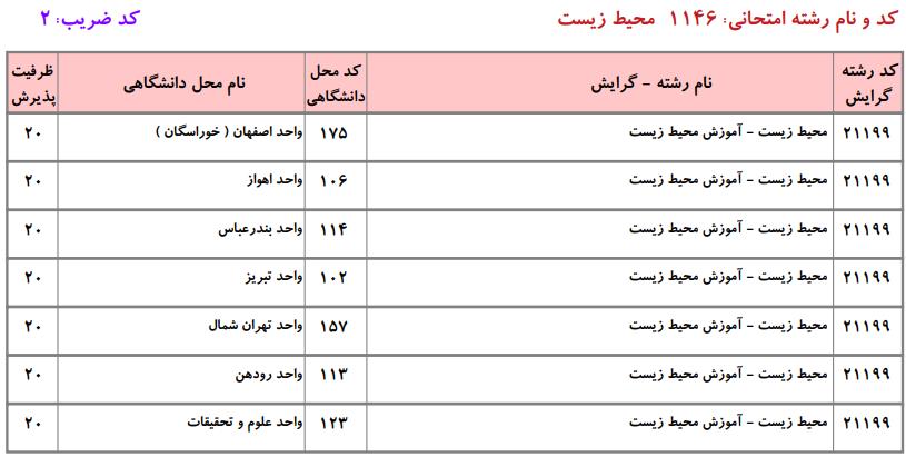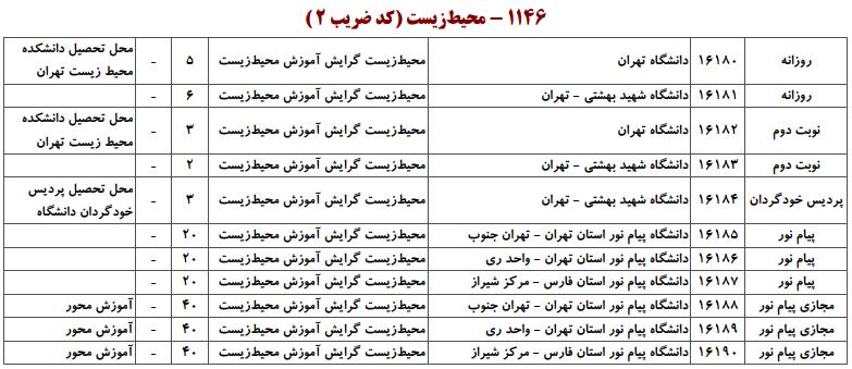 با توجه به این که تغییرات دانشگاههای پذیرنده یک رشته در مقطع کارشناسی ارشد در سالهای مختلف تغییرات زیادی ندارد، دانشگاههای جداول زیر که مربوط به آزمون کارشناسی ارشد سال گذشته است، میتواند به داوطلبان عزیز جهت اطلاع از گرایشهای کارشناسی ارشد محیط زیست و نیز دانشگاههایی که در دورههای مختلف روزانه، شبانه، پردیس، غیرانتفاعی، پیام نور و دانشگاه آزاد اﺳﻼمی در رشته محیط زیست پذیرش دارند، کمک کند.