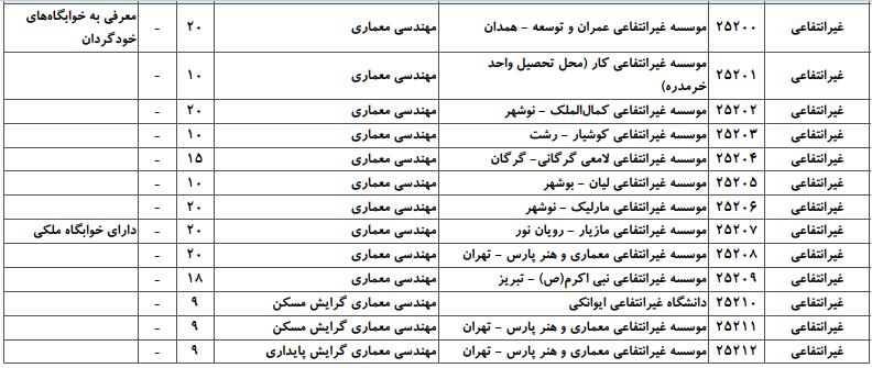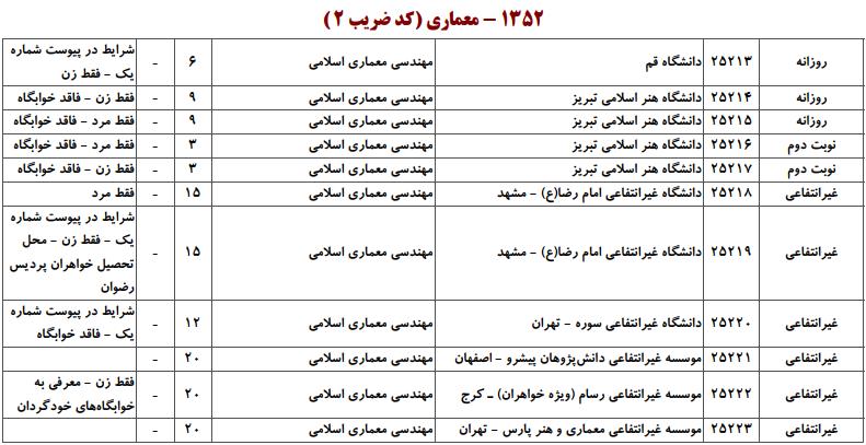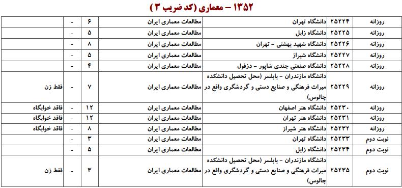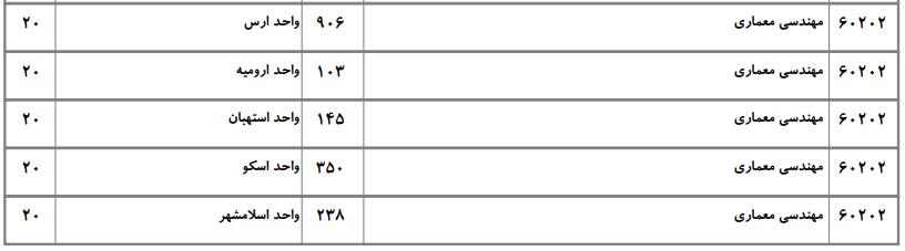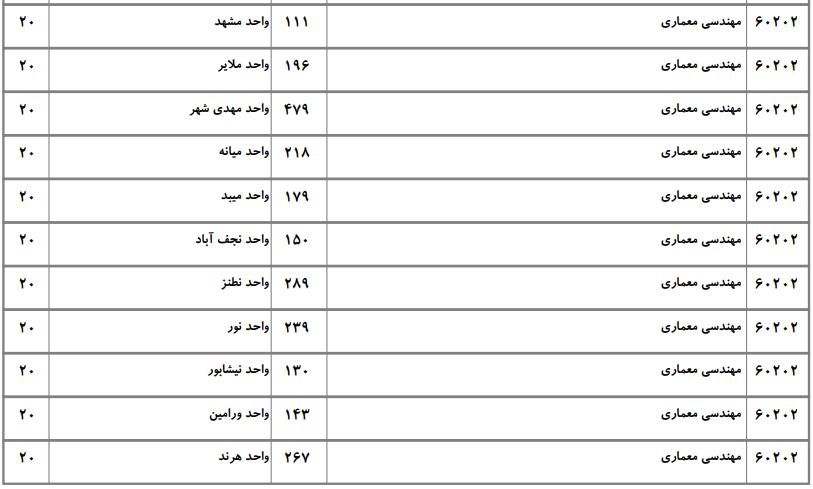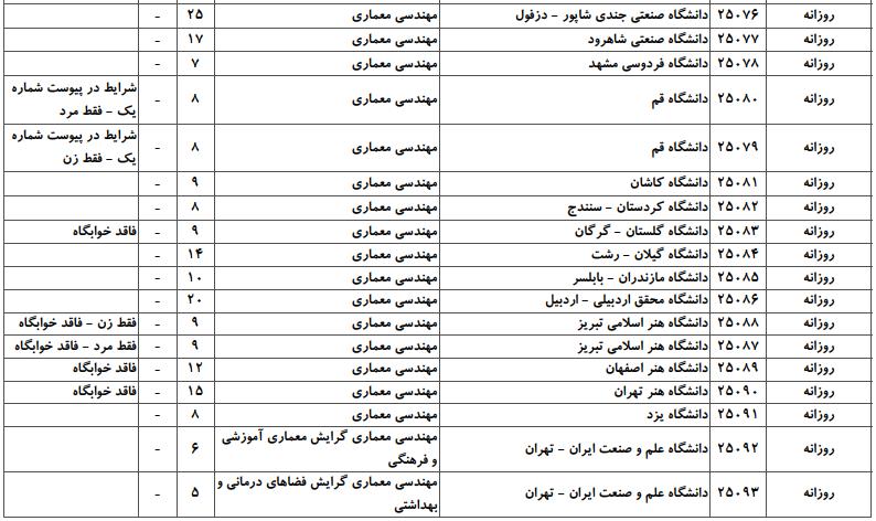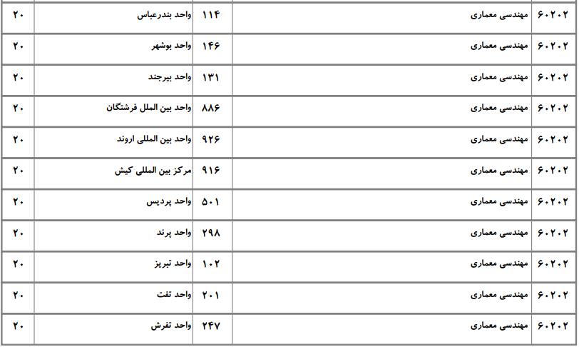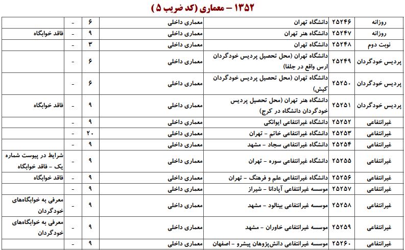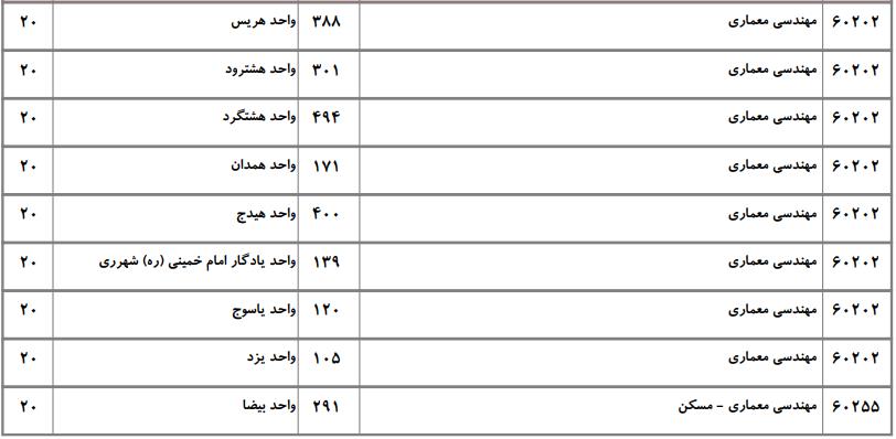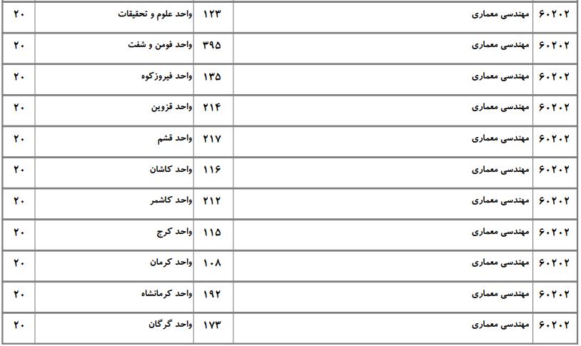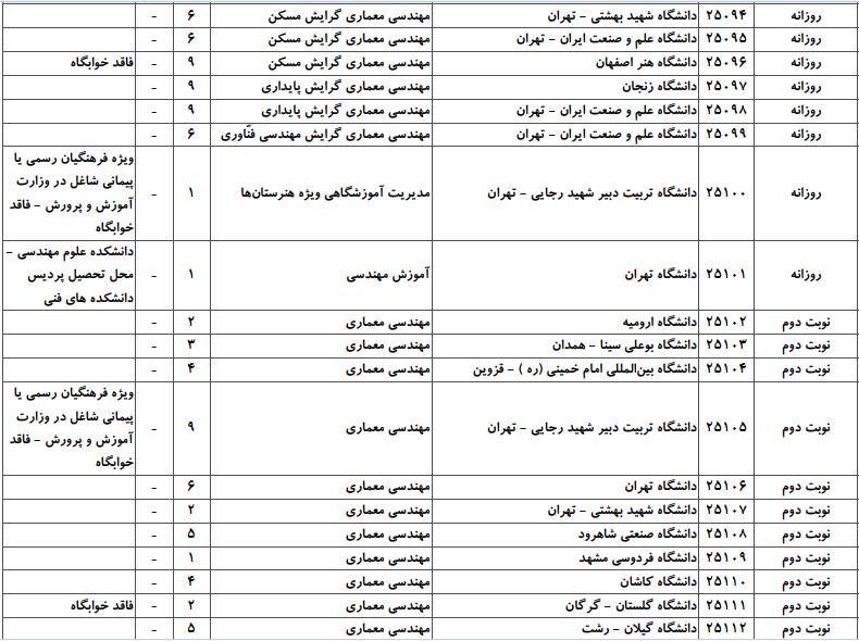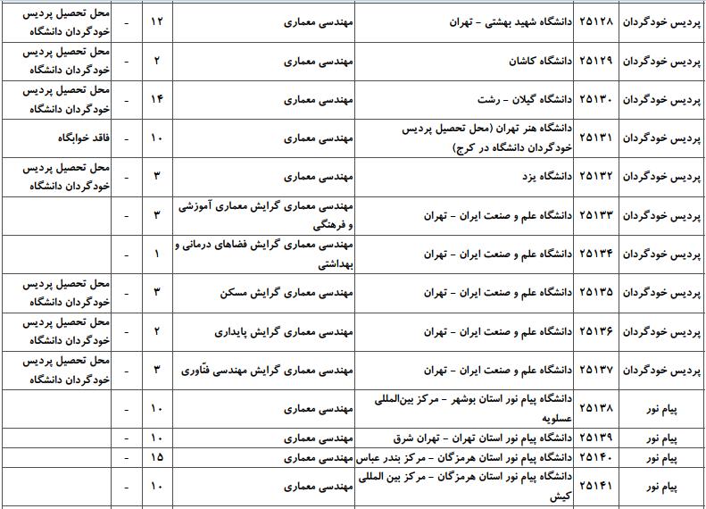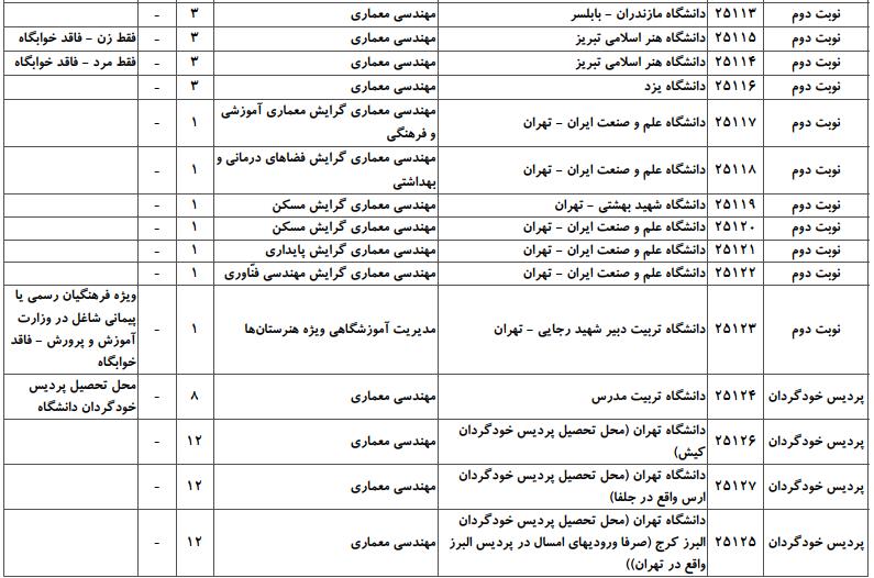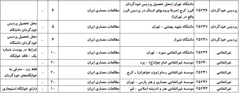 با توجه به این که تغییرات دانشگاههای پذیرنده یک رشته در مقطع کارشناسی ارشد در سالهای مختلف تغییرات زیادی ندارد، دانشگاههای جداول زیر که مربوط به آزمون کارشناسی ارشد سال گذشته است، میتواند به داوطلبان عزیز جهت اطلاع از گرایشهای کارشناسی ارشد معماری و نیز دانشگاههایی که در دورههای مختلف روزانه، شبانه، پردیس، غیرانتفاعی، پیام نور و دانشگاه آزاد اﺳﻼمی در رشته معماری پذیرش دارند، کمک کند.