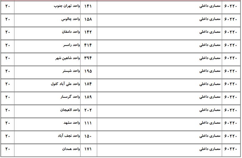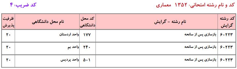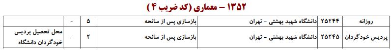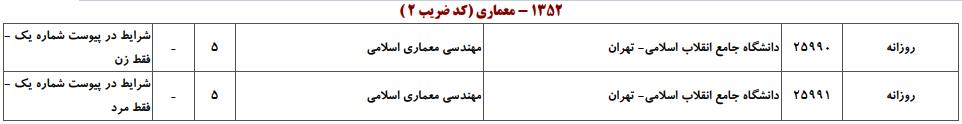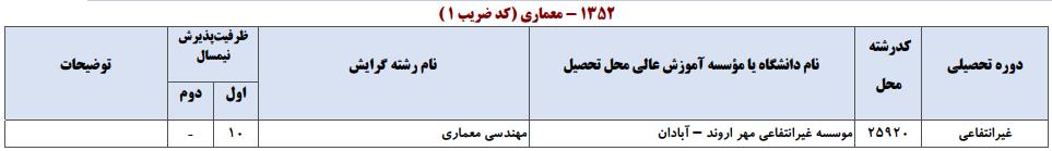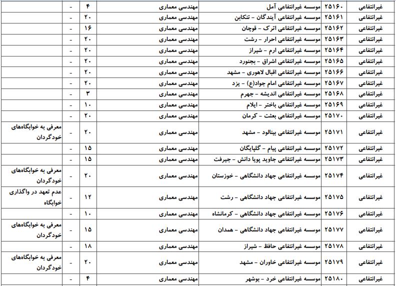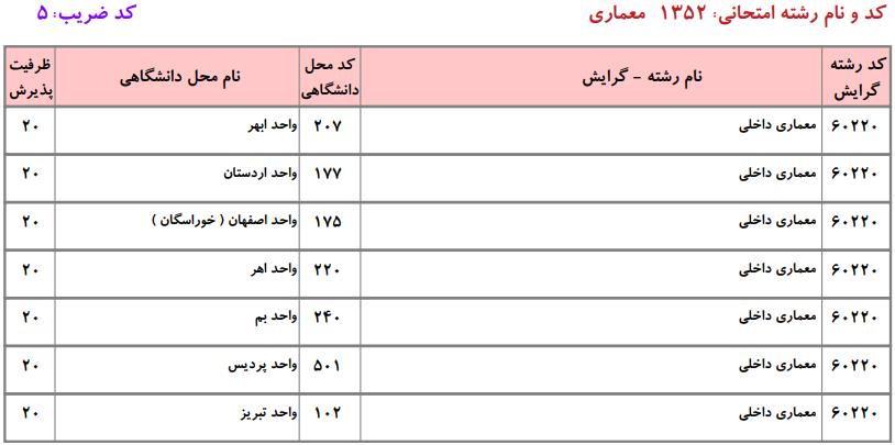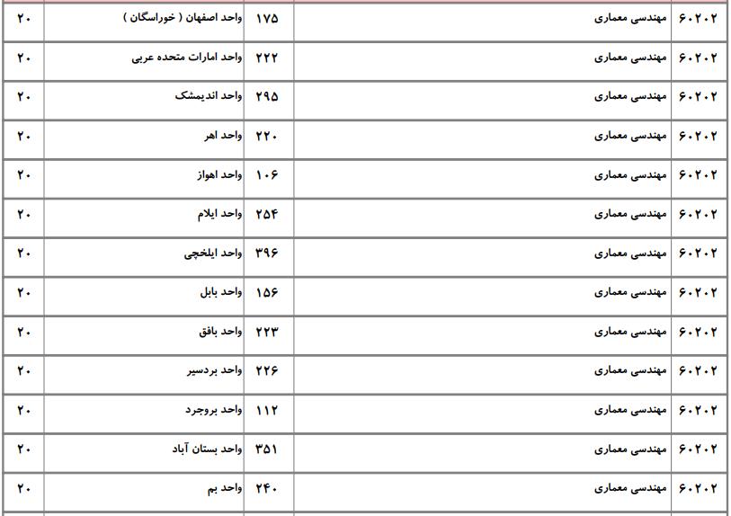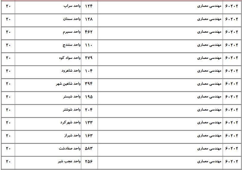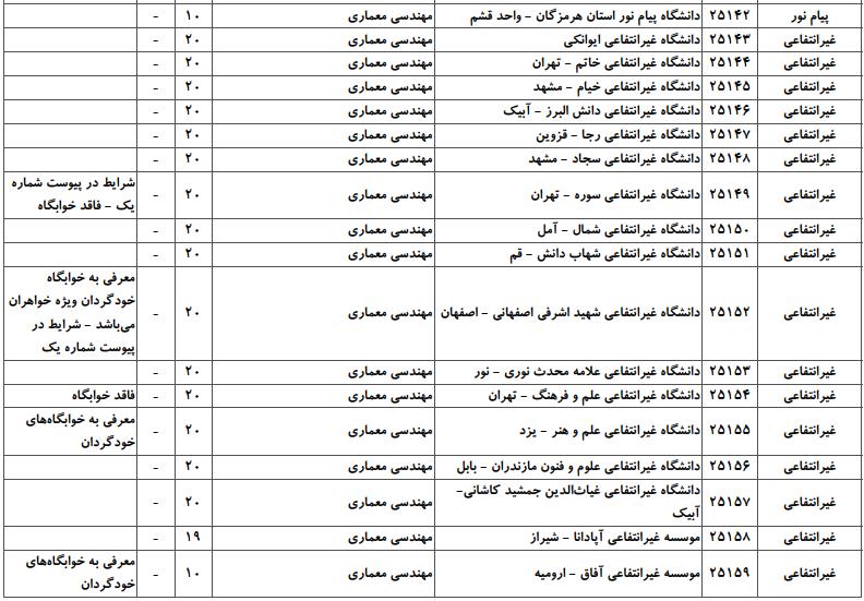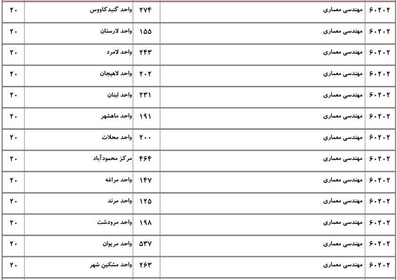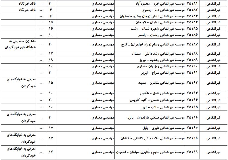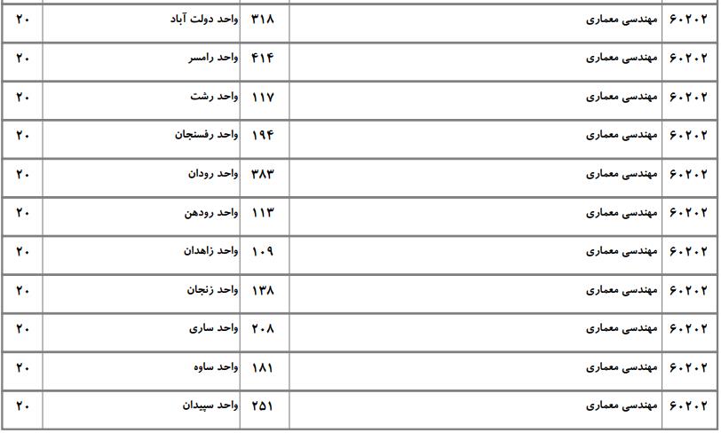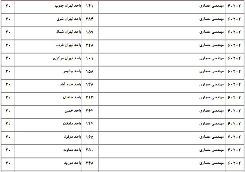با توجه به این که تغییرات دانشگاههای پذیرنده یک رشته در مقطع کارشناسی ارشد در سالهای مختلف تغییرات زیادی ندارد، دانشگاههای جداول زیر که مربوط به آزمون کارشناسی ارشد سال گذشته است، میتواند به داوطلبان عزیز جهت اطلاع از گرایشهای کارشناسی ارشد معماری و نیز دانشگاههایی که در دورههای مختلف روزانه، شبانه، پردیس، غیرانتفاعی، پیام نور و دانشگاه آزاد اﺳﻼمی در رشته معماری پذیرش دارند، کمک کند.