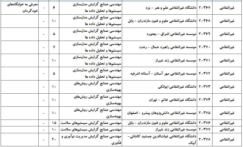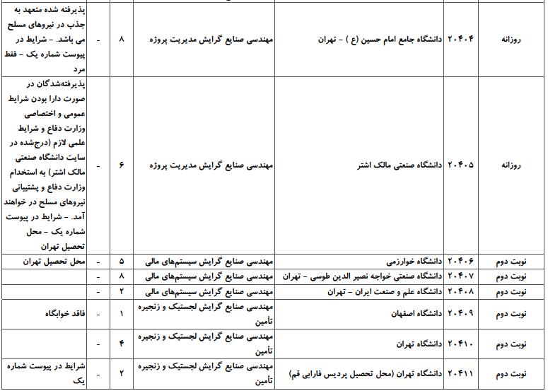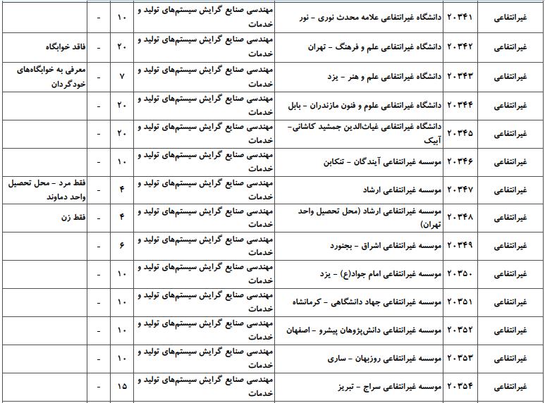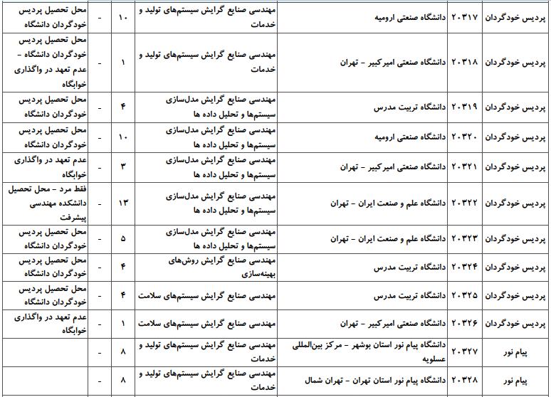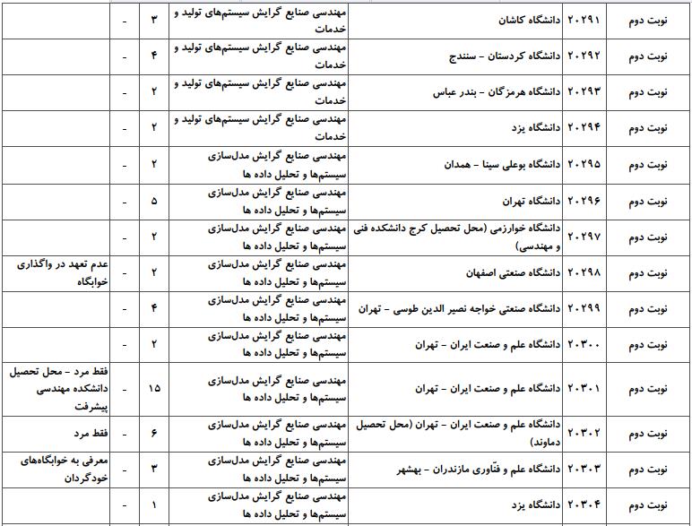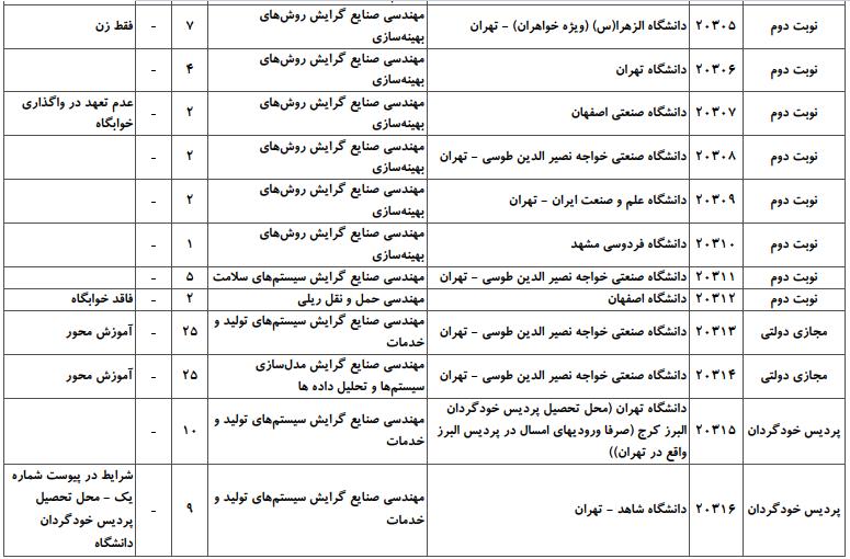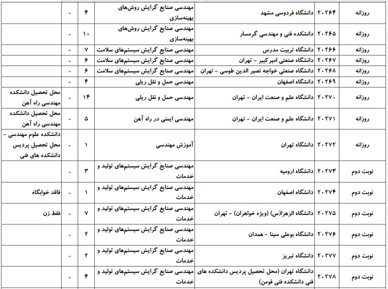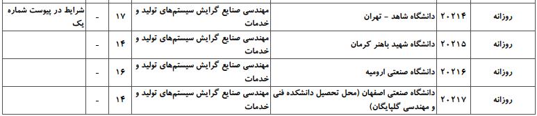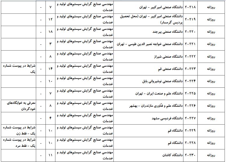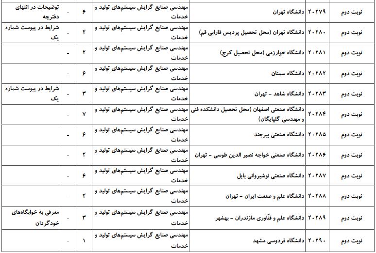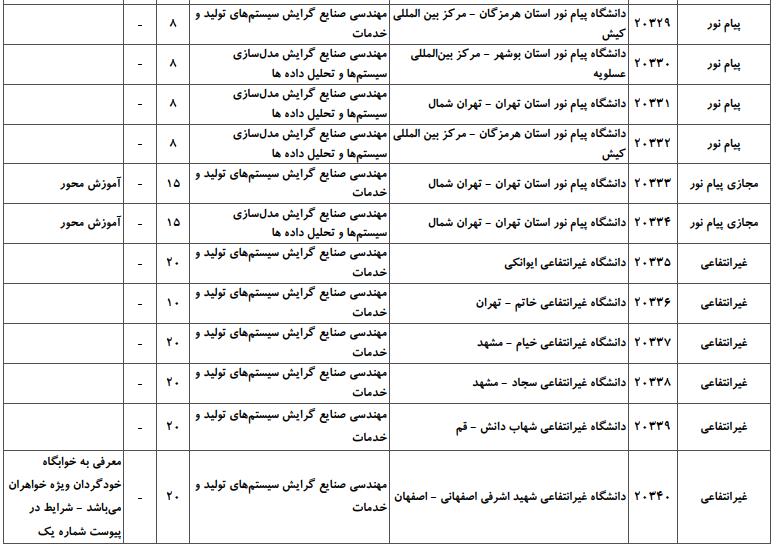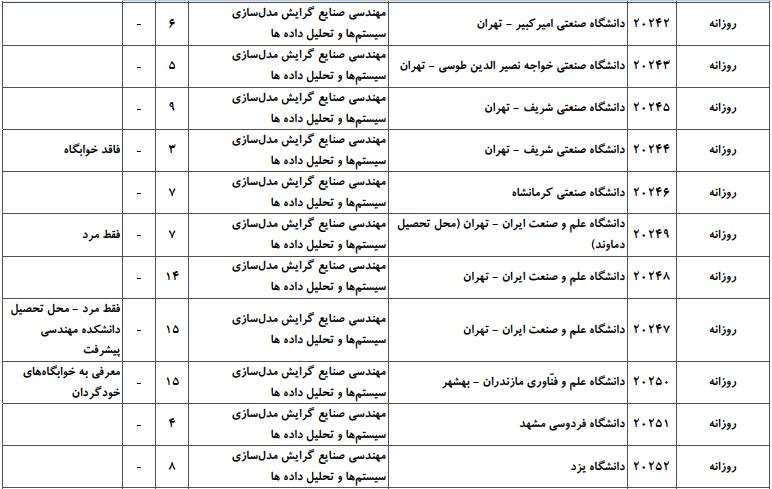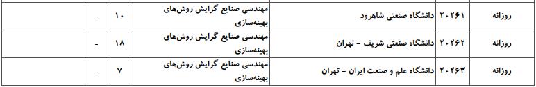 با توجه به این که تغییرات دانشگاههای پذیرنده یک رشته در مقطع کارشناسی ارشد در سالهای مختلف تغییرات زیادی ندارد، دانشگاههای جداول زیر که مربوط به آزمون کارشناسی ارشد سال گذشته است، میتواند به داوطلبان عزیز جهت اطلاع از گرایشهای کارشناسی ارشد مهندسی صنایع و نیز دانشگاههایی که در دورههای مختلف روزانه، شبانه، پردیس، غیرانتفاعی، پیام نور و دانشگاه آزاد اﺳﻼمی در رشته مهندسی صنایع پذیرش دارند، کمک کند.