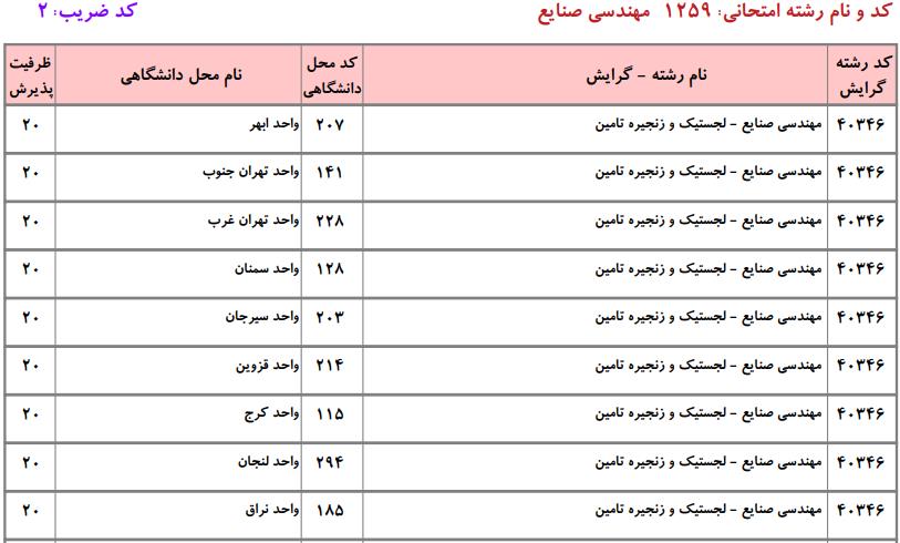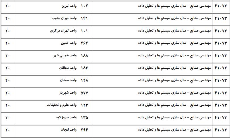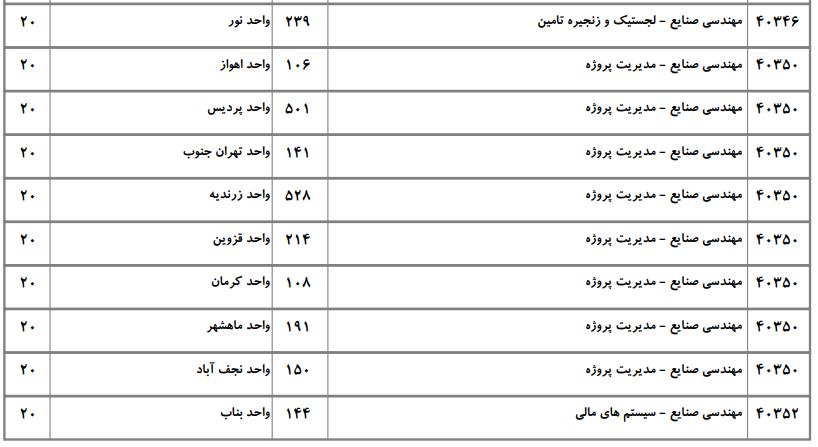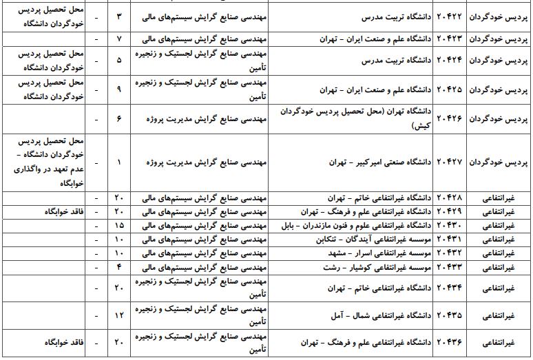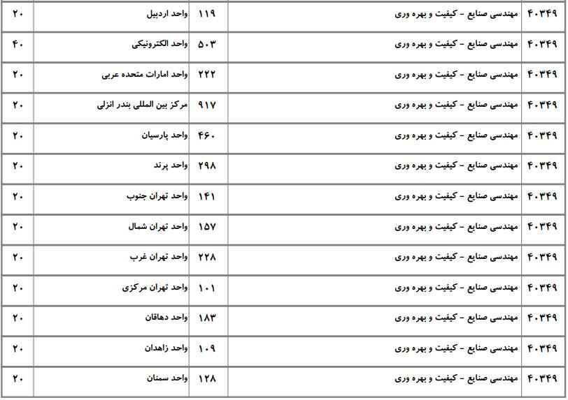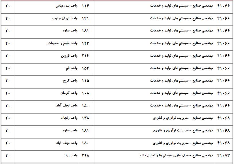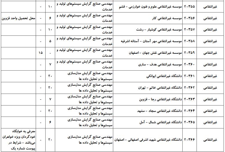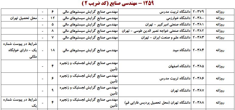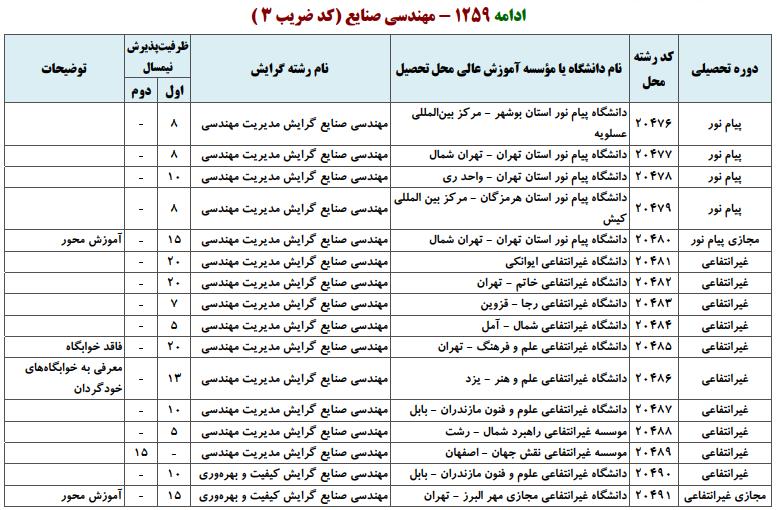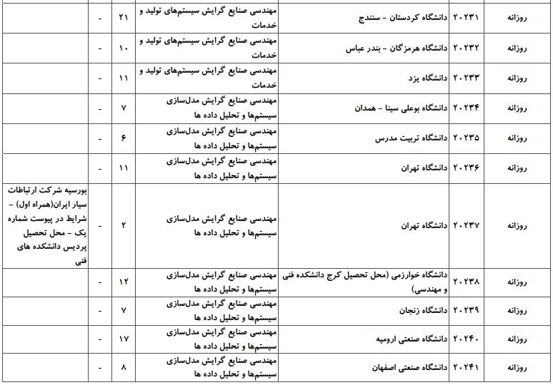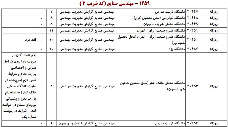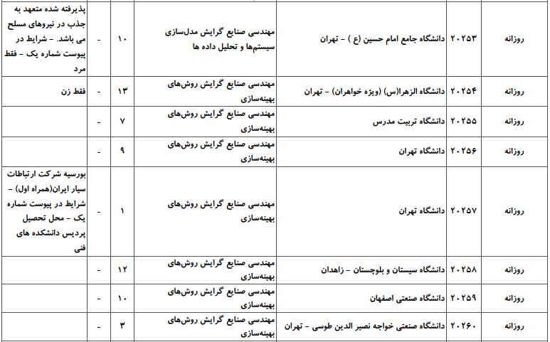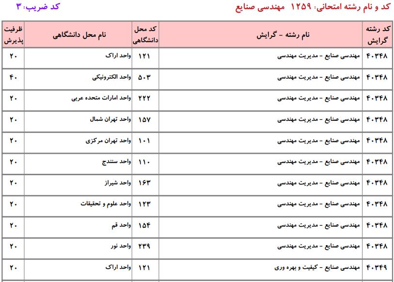 با توجه به این که تغییرات دانشگاههای پذیرنده یک رشته در مقطع کارشناسی ارشد در سالهای مختلف تغییرات زیادی ندارد، دانشگاههای جداول زیر که مربوط به آزمون کارشناسی ارشد سال گذشته است، میتواند به داوطلبان عزیز جهت اطلاع از گرایشهای کارشناسی ارشد مهندسی صنایع و نیز دانشگاههایی که در دورههای مختلف روزانه، شبانه، پردیس، غیرانتفاعی، پیام نور و دانشگاه آزاد اﺳﻼمی در رشته مهندسی صنایع پذیرش دارند، کمک کند.