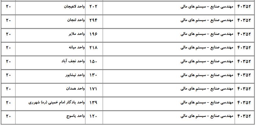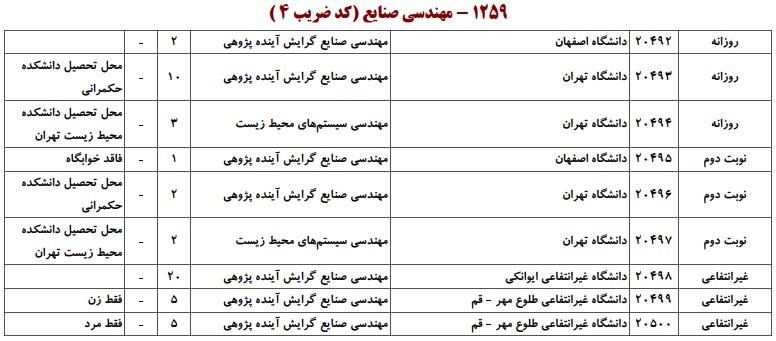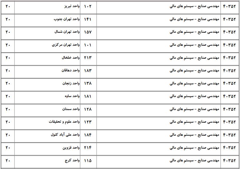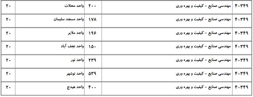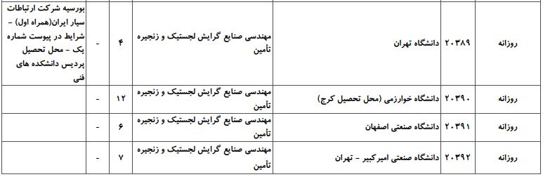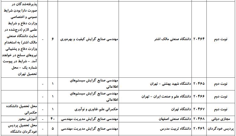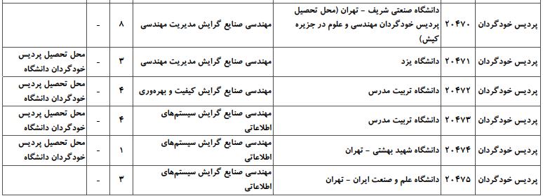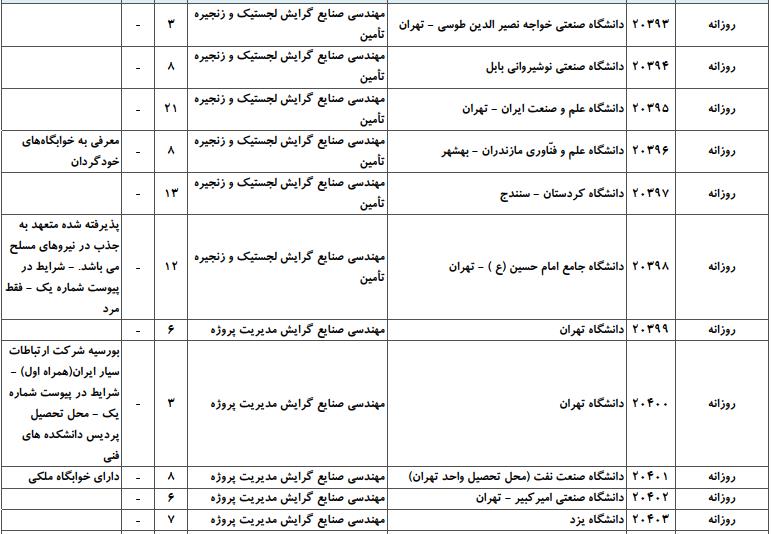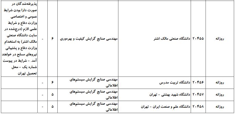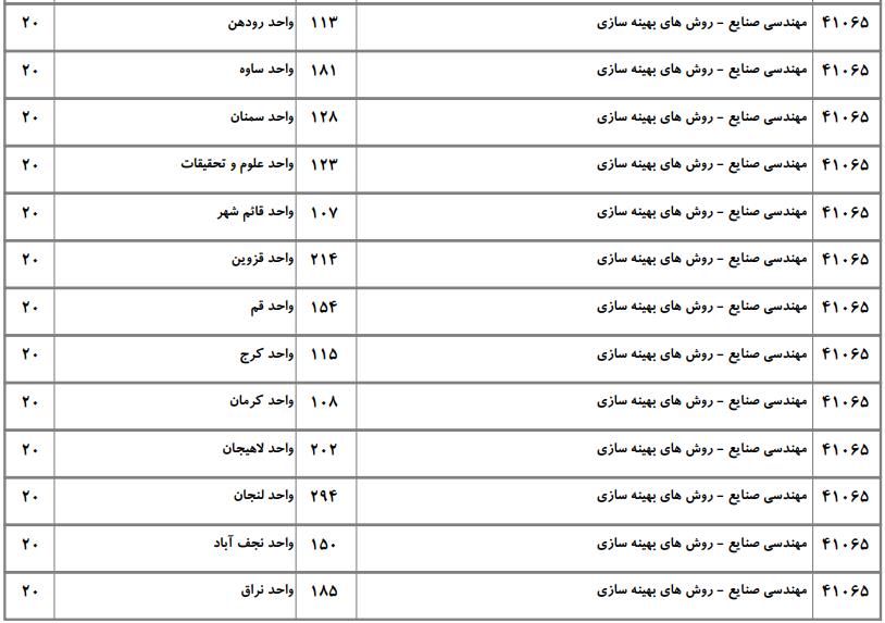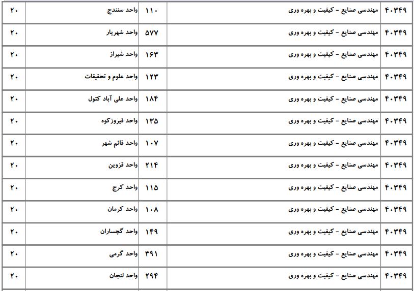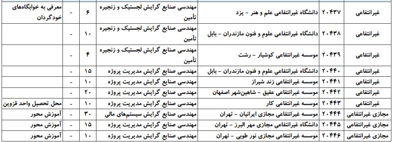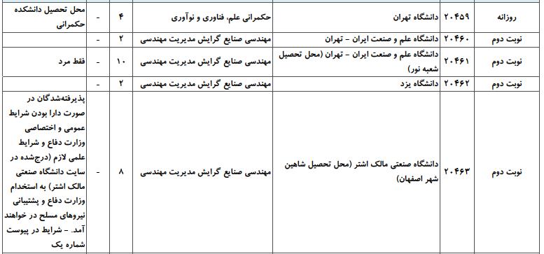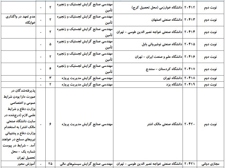 با توجه به این که تغییرات دانشگاههای پذیرنده یک رشته در مقطع کارشناسی ارشد در سالهای مختلف تغییرات زیادی ندارد، دانشگاههای جداول زیر که مربوط به آزمون کارشناسی ارشد سال گذشته است، میتواند به داوطلبان عزیز جهت اطلاع از گرایشهای کارشناسی ارشد مهندسی صنایع و نیز دانشگاههایی که در دورههای مختلف روزانه، شبانه، پردیس، غیرانتفاعی، پیام نور و دانشگاه آزاد اﺳﻼمی در رشته مهندسی صنایع پذیرش دارند، کمک کند.
