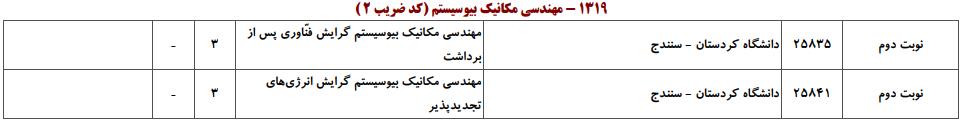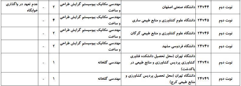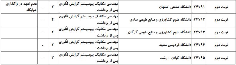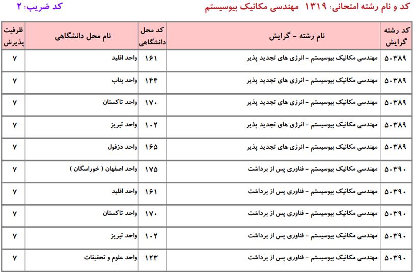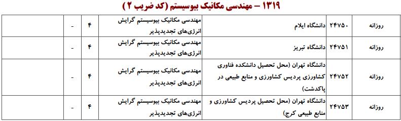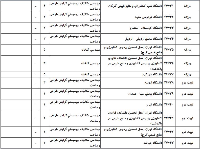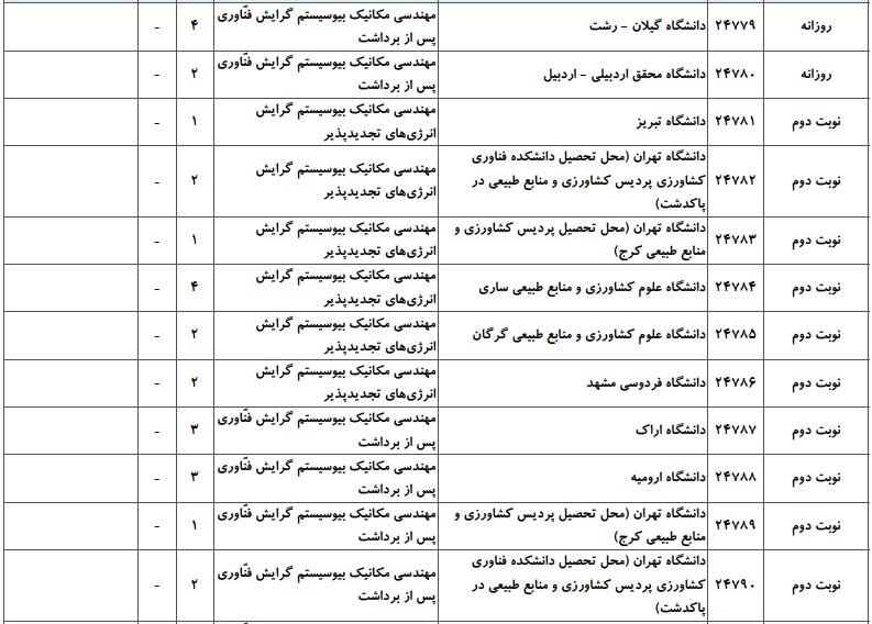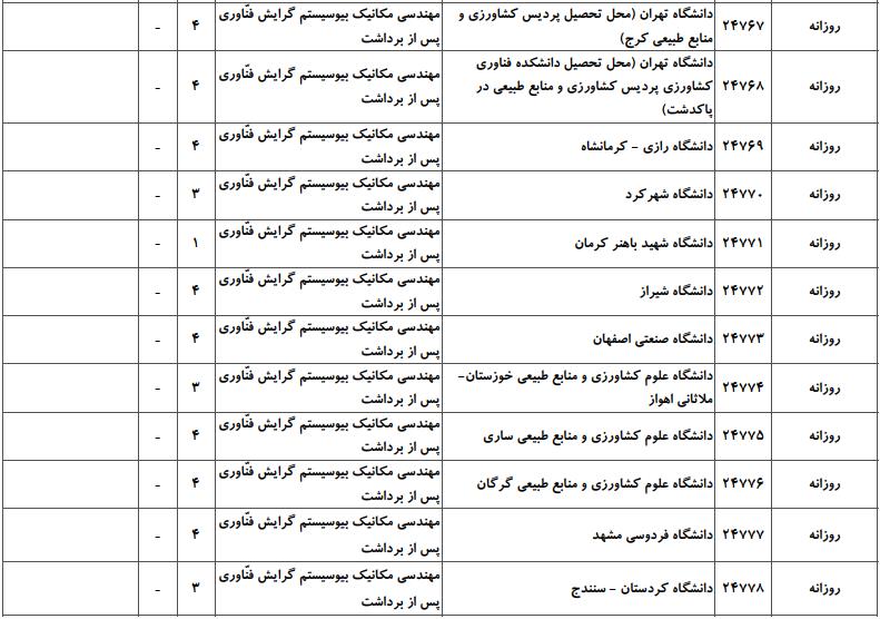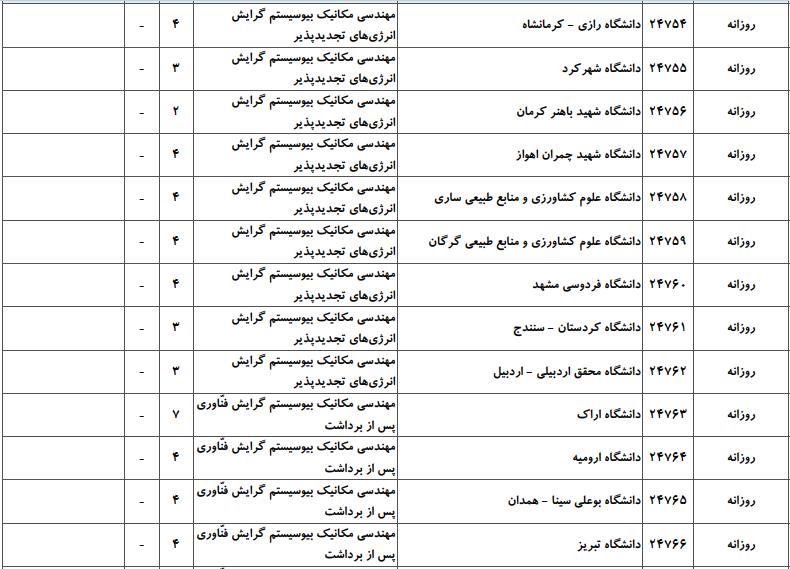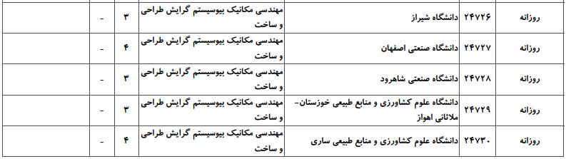 با توجه به این که تغییرات دانشگاههای پذیرنده یک رشته در مقطع کارشناسی ارشد در سالهای مختلف تغییرات زیادی ندارد، دانشگاههای جداول زیر که مربوط به آزمون کارشناسی ارشد سال گذشته است، میتواند به داوطلبان عزیز جهت اطلاع از گرایشهای کارشناسی ارشد مهندسی مکانیک بیوسیستم و نیز دانشگاههایی که در دورههای مختلف روزانه، شبانه، پردیس، غیرانتفاعی، پیام نور و دانشگاه آزاد اﺳﻼمی در رشته مهندسی مکانیک بیوسیستم پذیرش دارند، کمک کند.