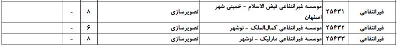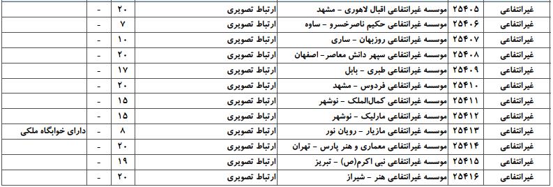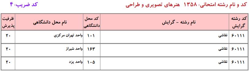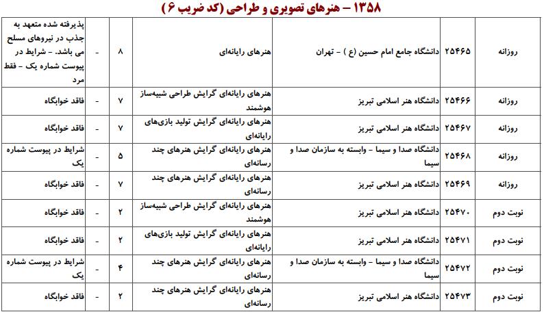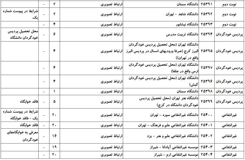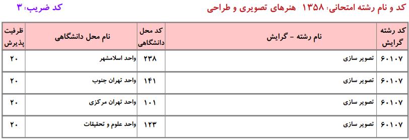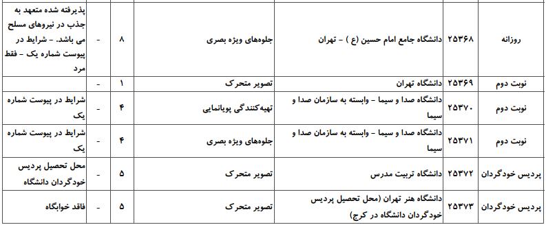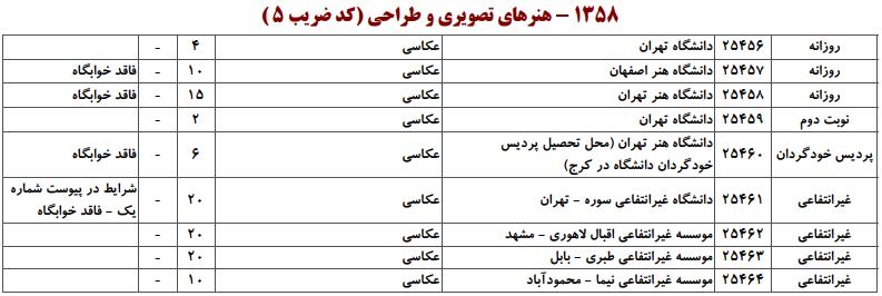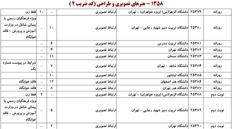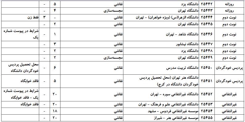 با توجه به این که تغییرات دانشگاههای پذیرنده یک رشته در مقطع کارشناسی ارشد در سالهای مختلف تغییرات زیادی ندارد، دانشگاههای جداول زیر که مربوط به آزمون کارشناسی ارشد سال گذشته است، میتواند به داوطلبان عزیز جهت اطلاع از گرایشهای کارشناسی ارشد هنرهای تصویری و طراحی و نیز دانشگاههایی که در دورههای مختلف روزانه، شبانه، پردیس، غیرانتفاعی، پیام نور و دانشگاه آزاد اﺳﻼمی در رشته هنرهای تصویری و طراحی پذیرش دارند، کمک کند.