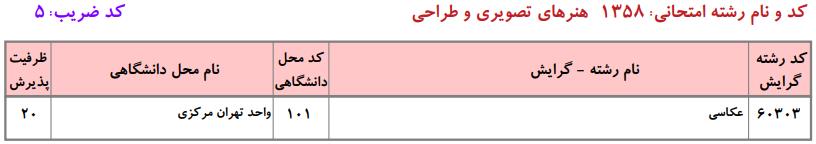 * پذیرش دانشجو در رشته عکاسی به صورت غیرمتمرکز و همراه با مصاحبه انجام می شود و نمره مصاحبه به عنوان یک درس با ضریب ۳ در نمره کل نهایی این رشته لحاظ می شود.
