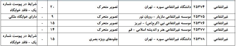 توجه: در رشته های: ۱- تصویر متحرک، ۲- ارتباط تصویری، ۳- تصویرسازی و ۴- نقاشی، آزمون به صورت تستی و تشریحی برگزار میگردد که پس از تصحیح اوراق تستی، از متقاضیانی که با توجه به نمره اکتسابی، مجاز به انتخاب رشته شده و فرم انتخاب رشته اینترنتی را نیز تکمیل نمایند، آزمون تشریحی به عمل خواهد آمد. ضمناً متقاضیانی مجازند فقط در دو پروژه عملی شرکت نموده و فقط از همان دو پروژه انتخاب رشته کنند. در رشته عکاسی مصاحبه تخصصی برگزار میشود.