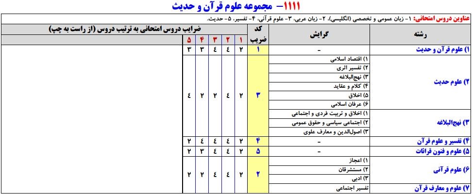 سرفصلهای کنکور کارشناسی ارشد علوم قرآن و حدیث به همراه ضرایب مربوطه به شرح زیر است: