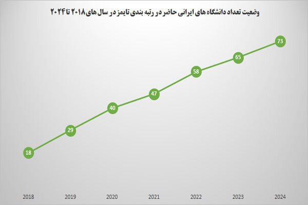 در پایگاه رتبه بندی تایمز در فاصله سالهای ۲۰۱۲ تا ۲۰۱۴ از ایران تنها یک دانشگاه حضور داشت. در سال ۲۰۱۵ دو دانشگاه صنعتی شریف و صنعتی اصفهان در این رتبه بندی حضور یافته و در سال ۲۰۱۶ تعداد دانشگاهها به ۸ مورد رسید. در سال ۲۰۱۷ این تعداد به ۱۳ دانشگاه افزایش و در سالهای ۲۰۱۸ و ۲۰۱۹ این تعداد به ترتیب به ۱۸ و ۲۹ دانشگاه افزایش یافته است.