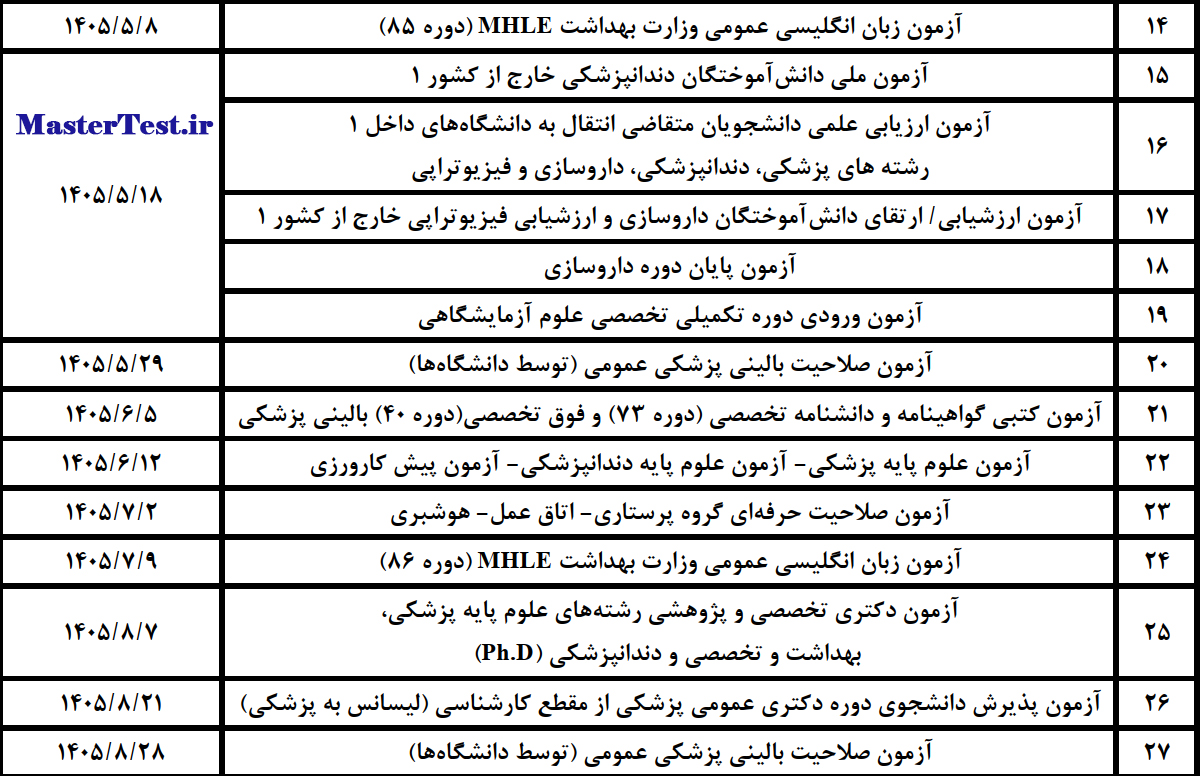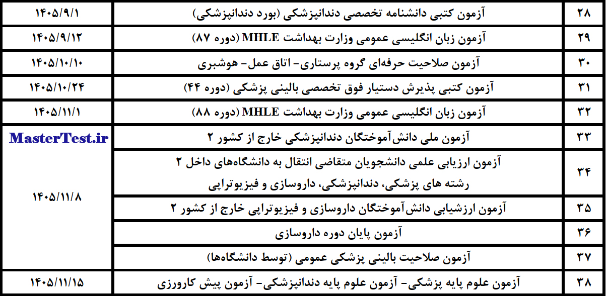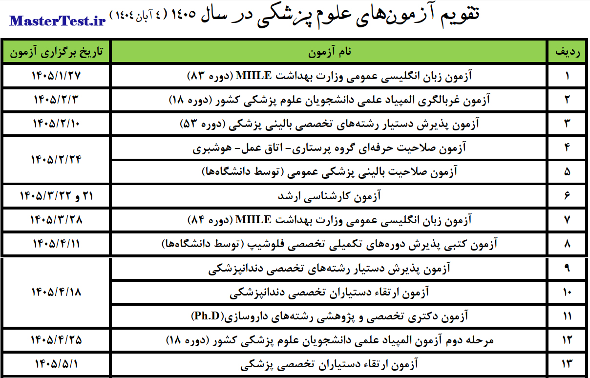 تقویم آزمون های وزارت بهداشت ۱۴۰۵